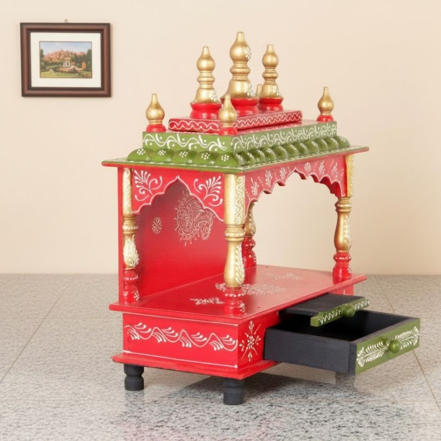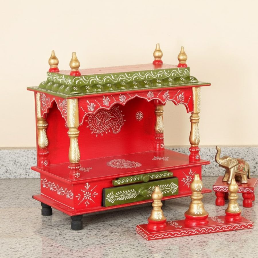 Enrich your pooja corner with this Rajasthani hand-painted wooden temple in a striking red, white and green palette, highlighted with golden domes and pillars for a royal look. The intricate paisley and floral artwork on the back panel, canopy and drawer front adds ethnic charm while beautifully framing your idols and photos. Compact yet functional, this mandir is ideal for tabletops or shelves, offering enough space for murti, diya plate and incense holder in apartments or offices. A smooth pull-out drawer at the base keeps camphor, matchbox and daily pooja essentials neatly organized, maintaining a clutter-free altar. Crafted from sturdy wood by skilled artisans, it is perfect for daily worship as well as gifting on housewarmings and festive occasions.