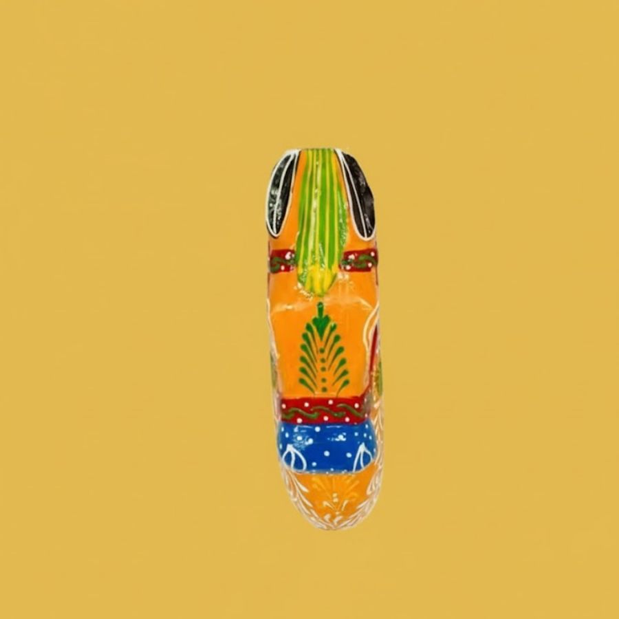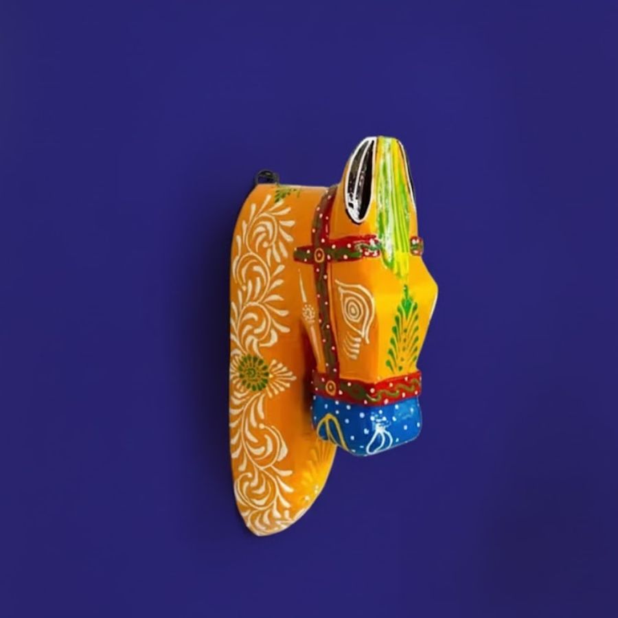 Brighten your walls with this vibrant yellow wooden horse face, inspired by traditional Rajasthani handicraft art. Hand-painted with intricate white floral and leafy motifs, it instantly adds color and folk charm to any living room, hallway, café or kids’ room wall. Compact at approximately 4 × 2 × 10 inches, this lightweight decor piece is easy to hang and fits beautifully in gallery walls or above consoles and sideboards. Crafted from durable wood and finished with multi-color detailing on the mane and harness, it works equally well as a single accent or paired with other Rajasthani artifacts for a coordinated ethnic look. An eye-catching gift choice for housewarmings, festivals and birthdays, this piece celebrates India’s rich folk artistry in a modern home setting.