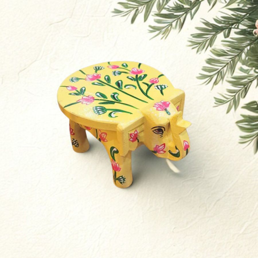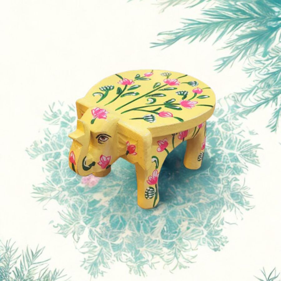 Discover the charm of this handcrafted Wooden Elephant Stool in vibrant yellow sandal color, adorned with intricate pink and green floral designs. Shaped like a playful elephant, this small Indian handicraft measures 4.5 inches high and 7 inches length x 5 inches wide, blending functionality with ethnic artistry. Perfect for elevating home decor, pooja setups, or foyer accents, its hand-painted solid wood construction brings Rajasthan’s folk heritage to life. The sturdy round seat doubles as a side table or plant stand, adding whimsy and cultural depth to any space. Ideal for gifting or modern interiors, each piece showcases unique artisan brushstrokes for timeless appeal. Embrace tradition with this vibrant, durable decor essential.