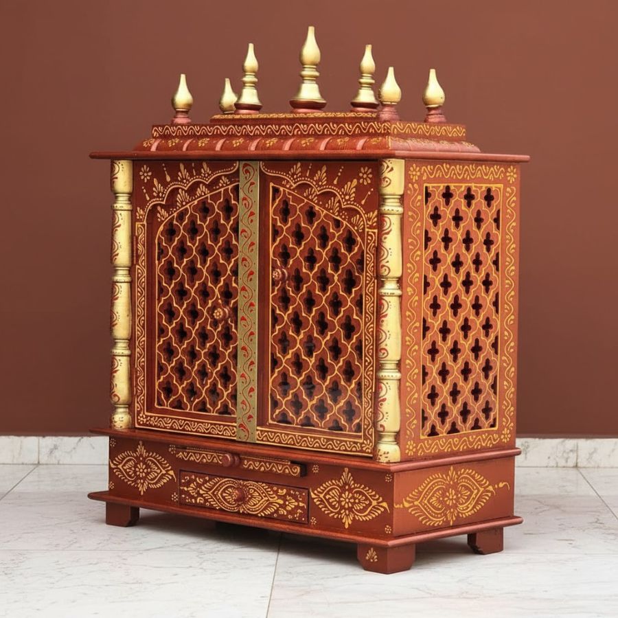 - Front storage drawer for organizing pooja accessories and small essentials.