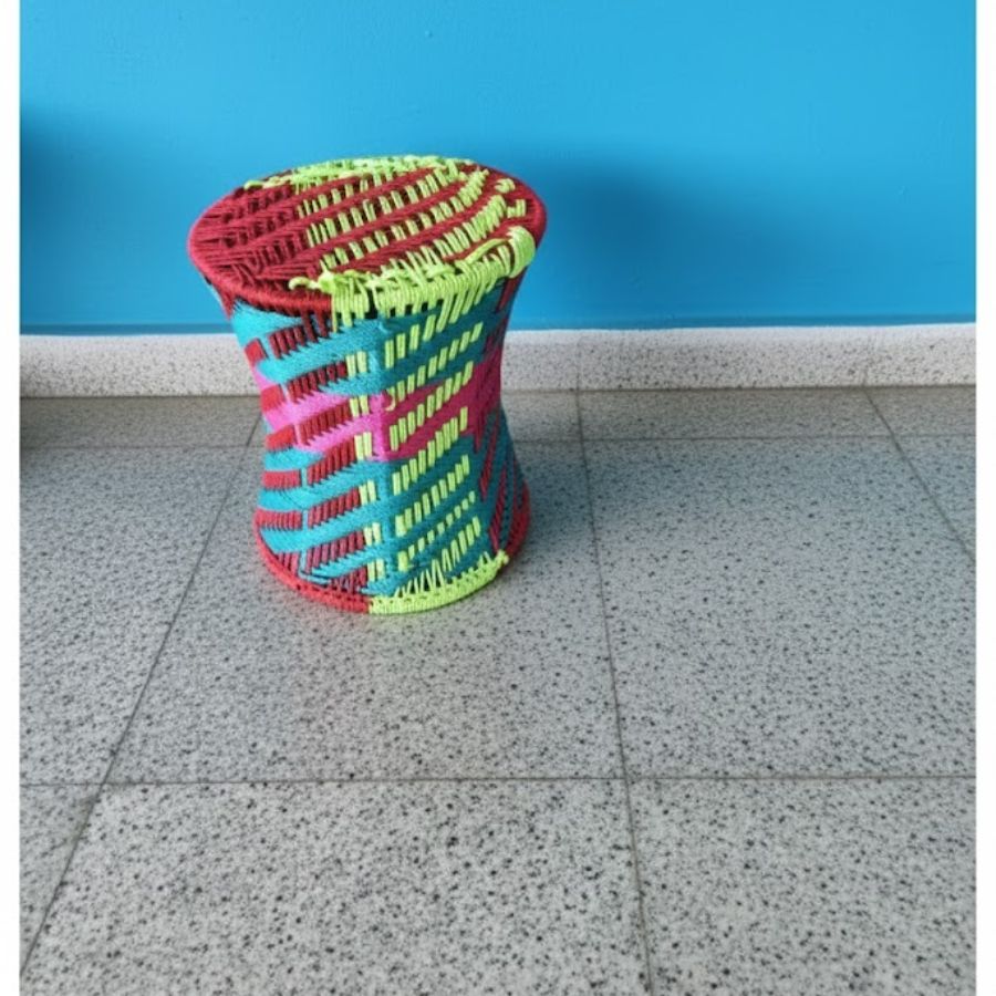 Add a vibrant touch of handcrafted charm to your home with this colorful handwoven iron base woven mudha stool. Expertly crafted by skilled artisans, this compact mudha stool features a sturdy base wrapped in durable woven rope, creating a striking blend of texture and color. The lively multicolor pattern instantly brightens living rooms, bedrooms, kids’ spaces, balconies, or creative corners. Lightweight yet strong, it works perfectly as a seating stool, side table, footrest, or decorative accent. Designed to celebrate sustainable materials and traditional weaving techniques, this unique stool brings functionality, comfort, and joyful character to modern as well as bohemian interiors.