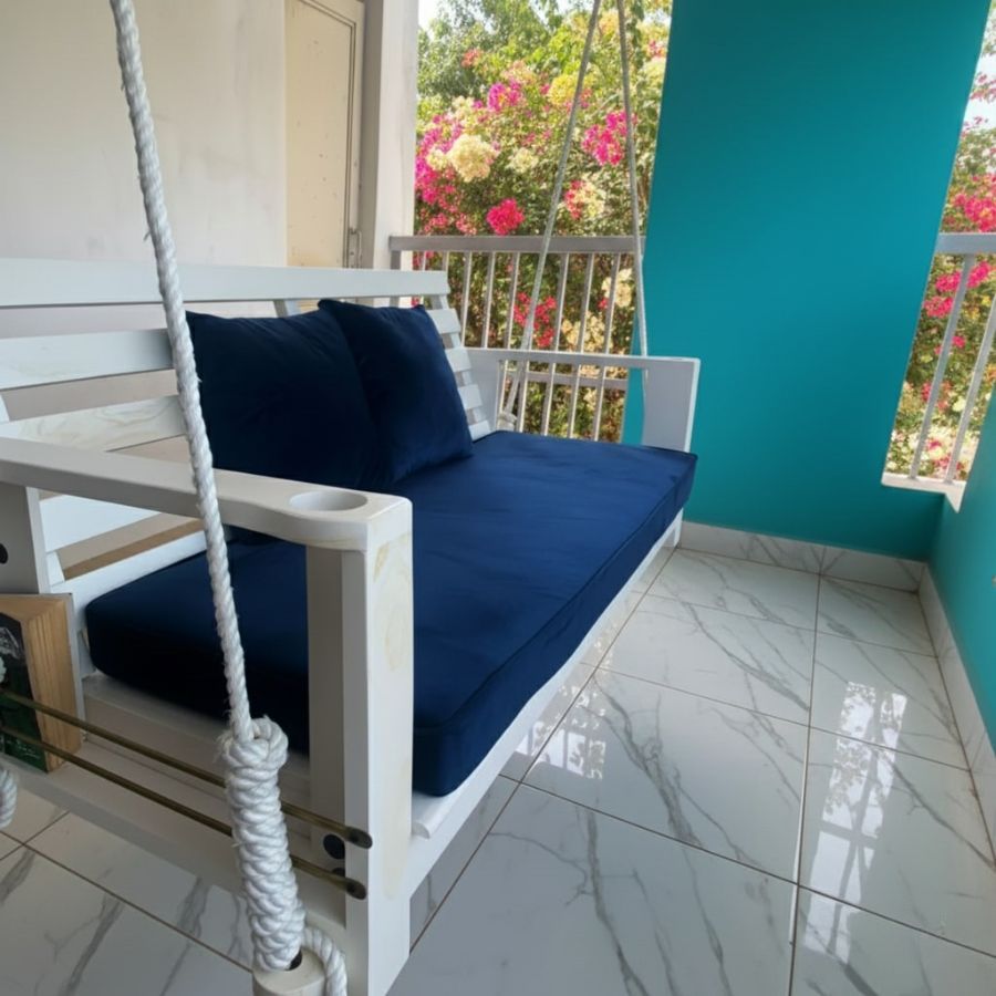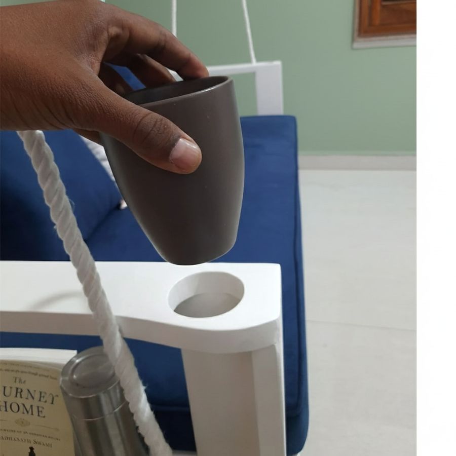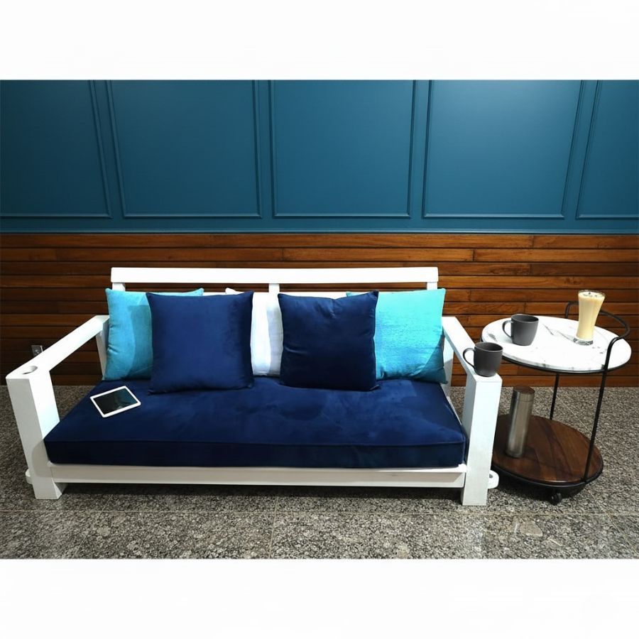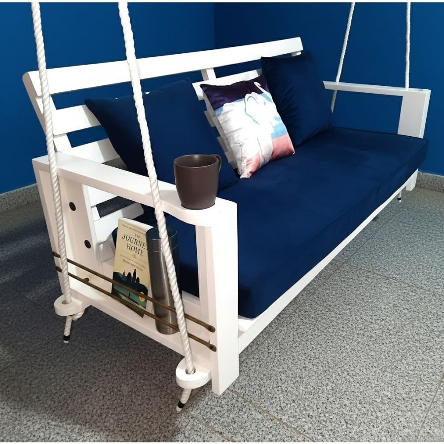 The Hartley Porch Solid Wood Swing (Jhula) brings effortless elegance and practical features to indoor or covered outdoor spaces, finished in a striking ivory white for a chic, contemporary look. Crafted from seasoned Sheesham wood, this swing includes extended legs for optional floor seating, a cup-holder armrest, and a built-in magazine holder, making it perfect for relaxing, reading, or enjoying refreshments. Deep seating and an inclined backrest ensure superior comfort, while a plush mattress and pillows add luxury to your porch, living room, or bedroom.