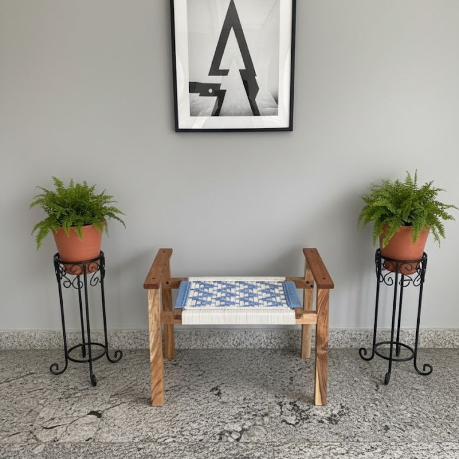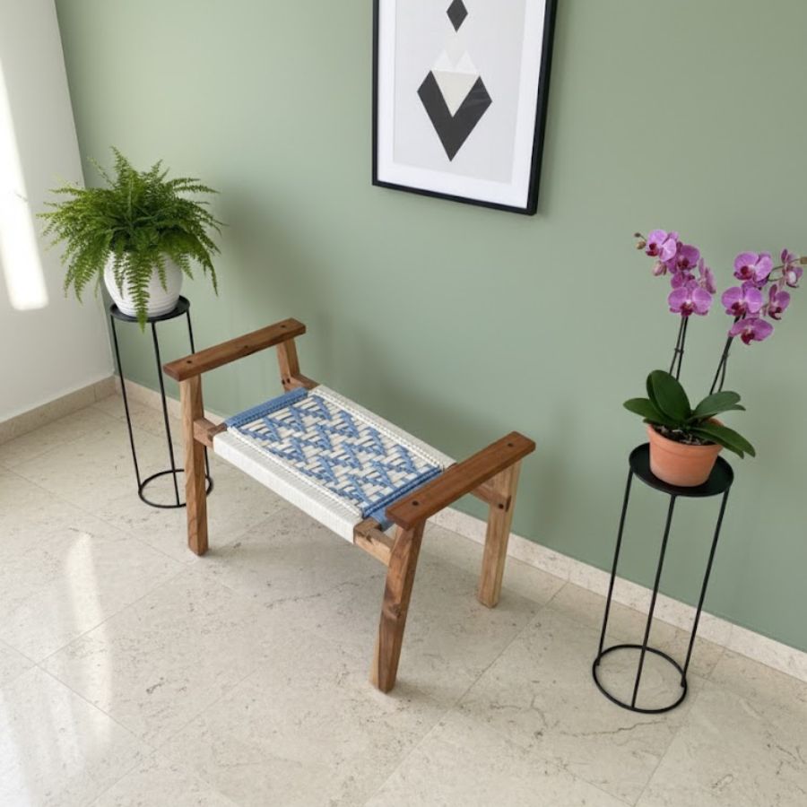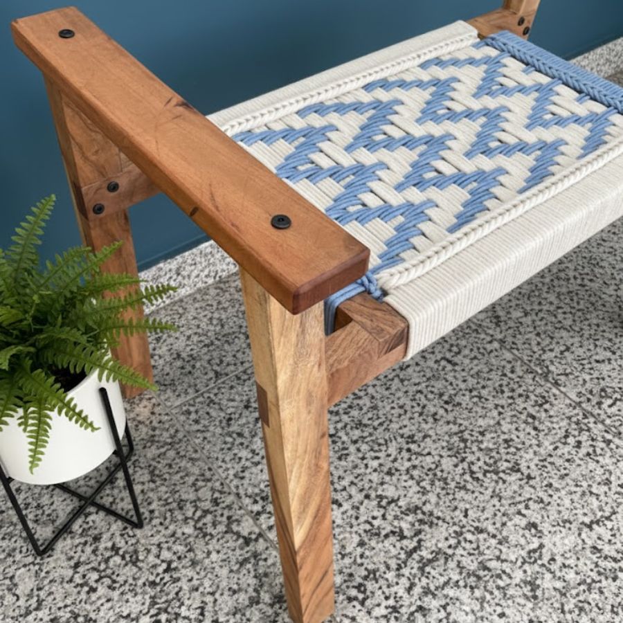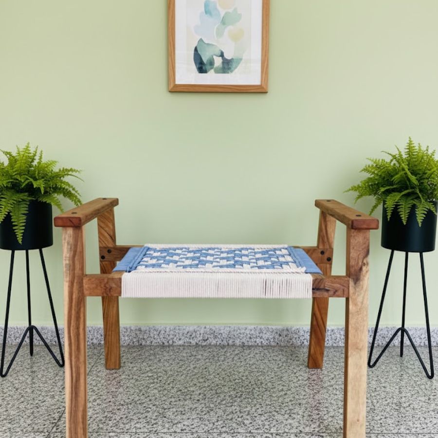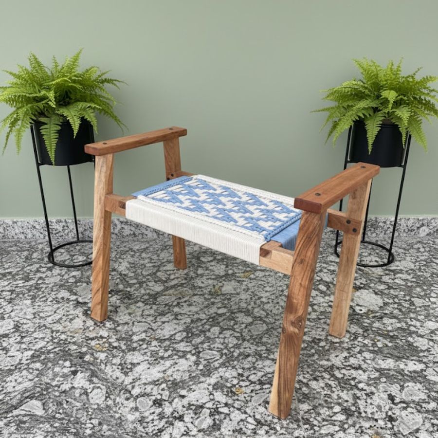 This Hettie Solid Wood Hand Rest Woven Stool (White & Blue) showcases a striking combination of white and blue cotton cord artfully braided and set over a sturdy solid wood frame. Designed to add a playful, sculptural accent to any modern interior, this piece blends traditional craftsmanship with minimalist form. Ideal for bedrooms, living rooms, balconies, or garden spaces, its compact, lightweight build ensures easy versatility. The bench’s detailed weave and subtle armrests invite both comfort and contemporary flair. With a seating height of 40 cm and durable materials, it’s a refined, practical addition that celebrates artisanal artistry and functional elegance.