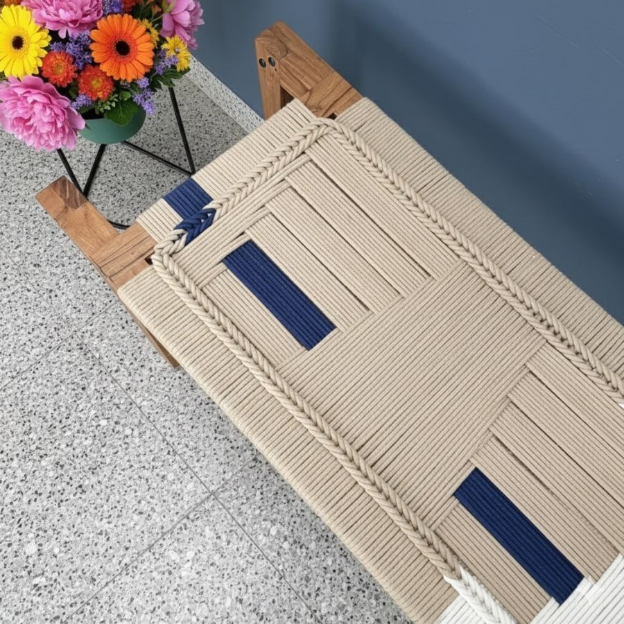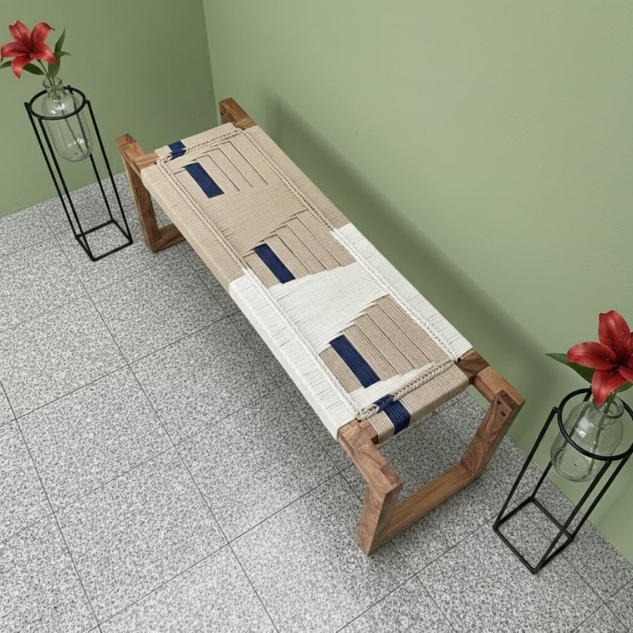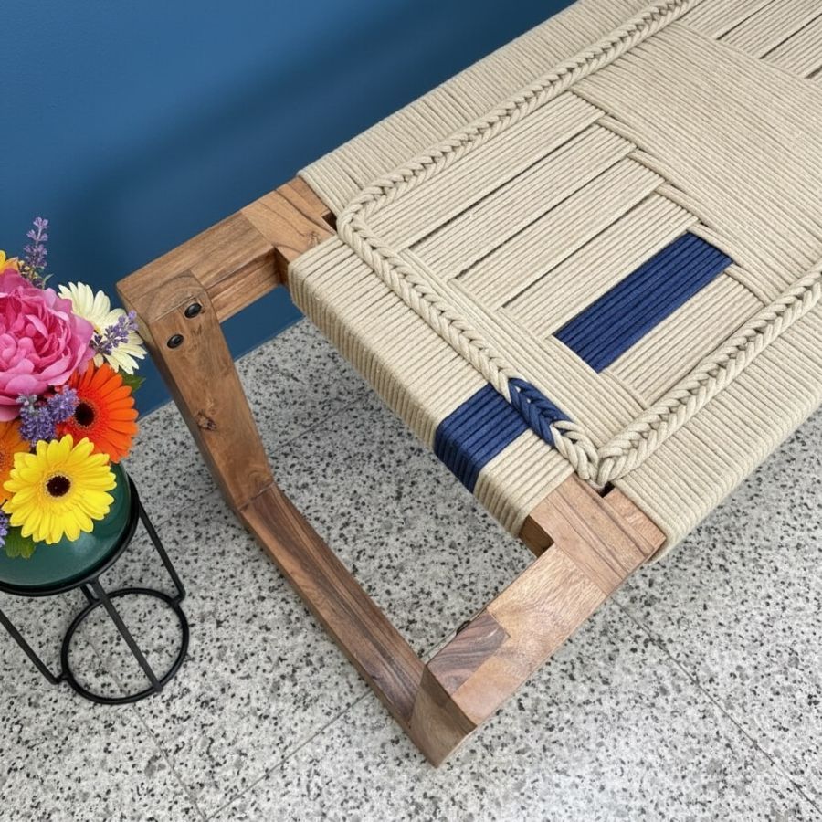 Furnshine – Jojo Solid Wood Handmade Entryway Woven Bench (Beige, Blue & White)