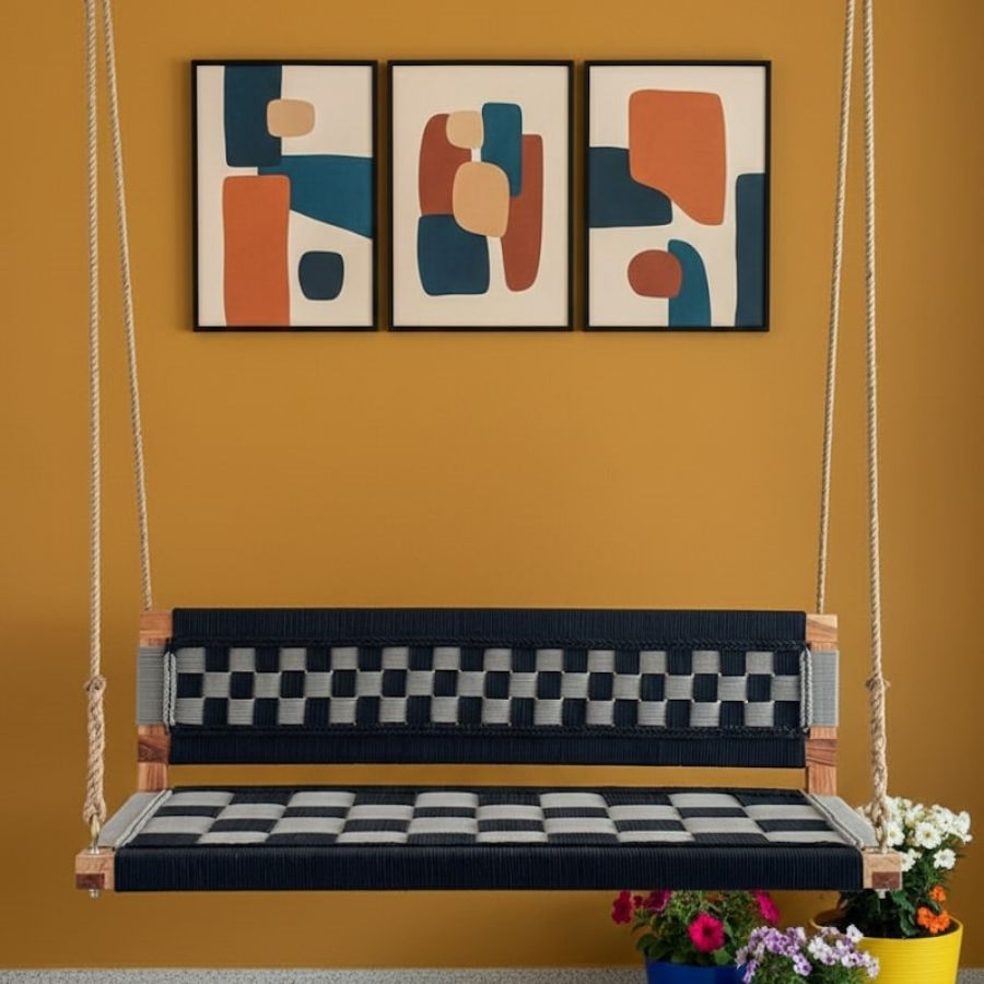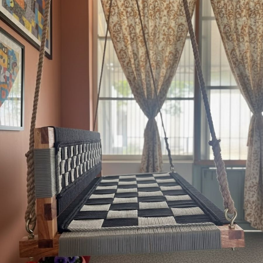 This Jonesy Black and Gray Woven Swing with Backrest from Furnshine is a striking statement piece for any indoor or semi-outdoor space. Handcrafted from sustainable Acacia wood and robust natural hemp rope, the swing features a bold geometric weave that promises both comfort and visual appeal. Designed for adults and kids, it supports up to 250 kg for relaxing moments alone or with company. Easy to install and meticulously finished, this swing brings a blend of tradition and modern elegance to homes and patios.