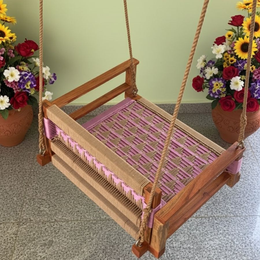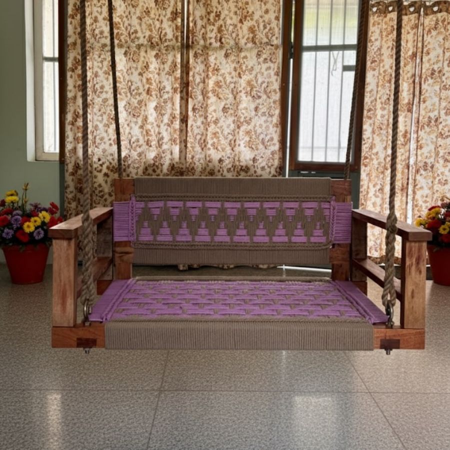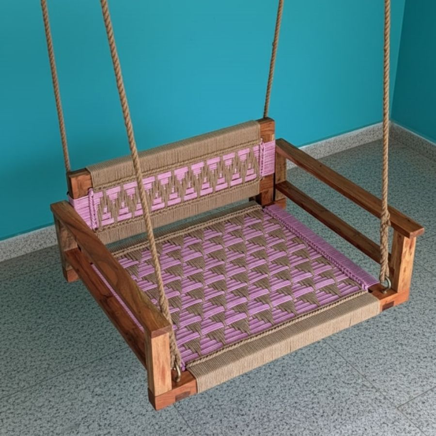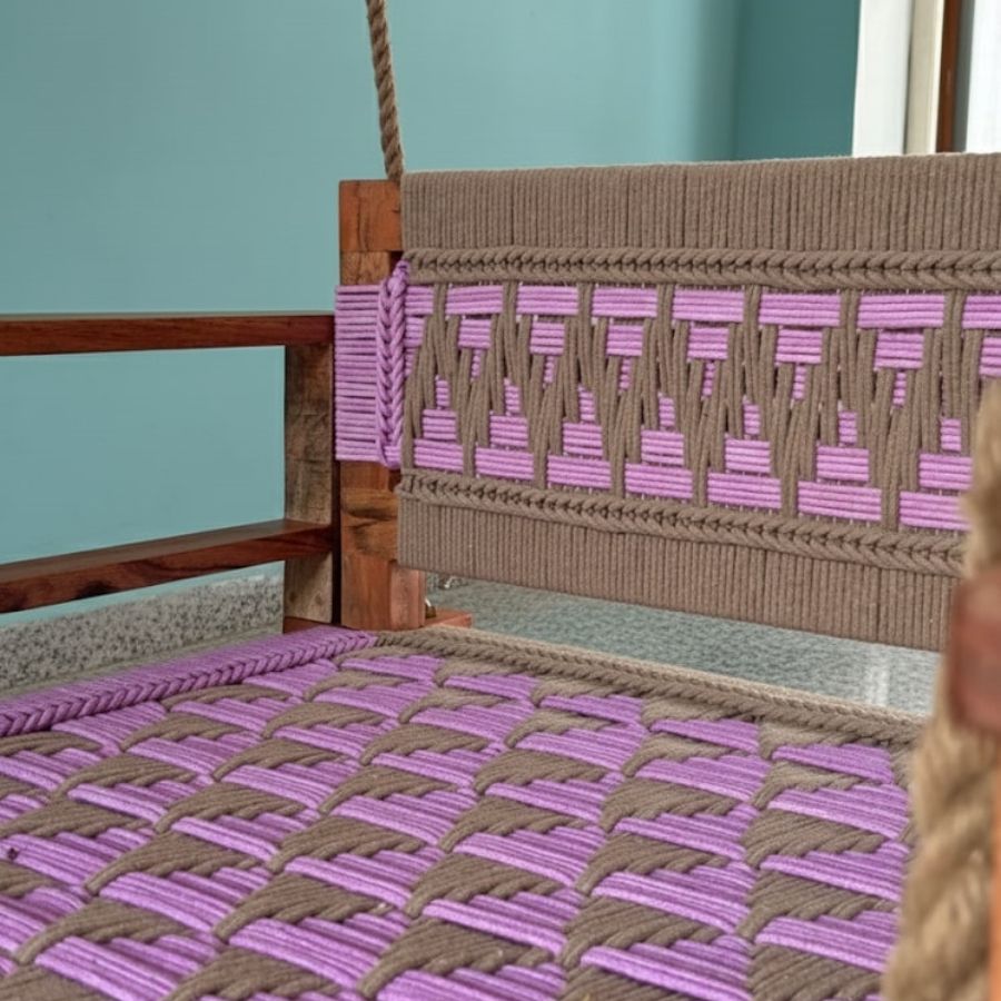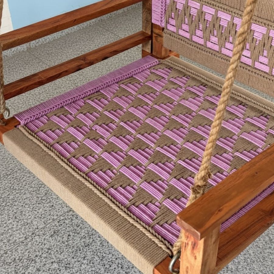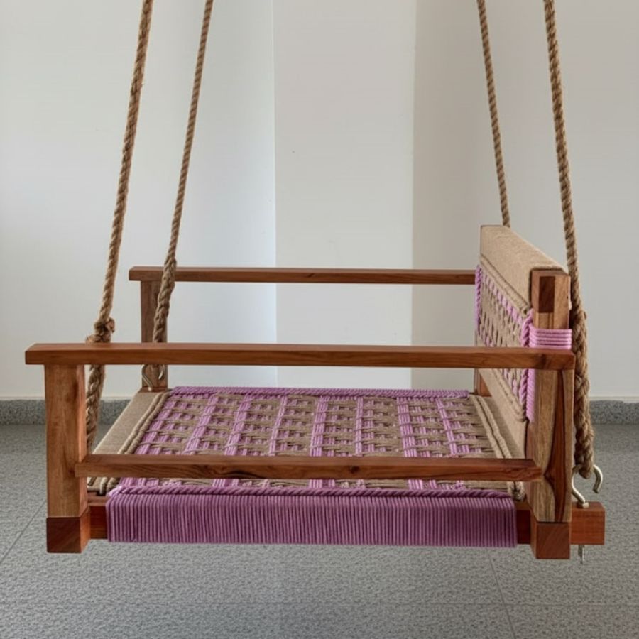 The Jonesy Single Seater Armrest Backrest Swing (Pastel Pink & Beige Tones) brings together comfort, style, and craftsmanship for homes or outdoor spaces. Featuring a sturdy acacia wood frame, natural hemp ropes, and hand-braided cotton seat in soothing lilac and beige, this swing is perfect for adults and kids. The thoughtful addition of armrests and a supportive backrest ensure ergonomic seating, making it ideal for porches, balconies, or living rooms. Each swing is carefully handcrafted, reflecting quality and sophistication in every detail, and fits seamlessly with both modern and classic interiors.