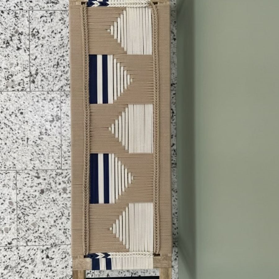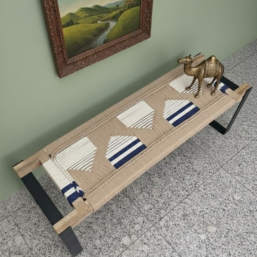 This is a modern Karter Classic Two Seater Woven Bench with Metal Legs (Beige, White & Blue) and a beautifully handwoven cotton cord seat in beige, white, and blue tones. Crafted with domestically sourced solid wood and 4 mm braided cotton, it blends functionality with artisanal design, making it a perfect fit for entryways, living rooms, bedrooms, balconies, or gardens. The bench measures 120 x 35 x 40 cm and supports up to 13 kg in weight. Easy to assemble with minimal tools, it offers lasting durability and a chic look suited for homes and offices alike.