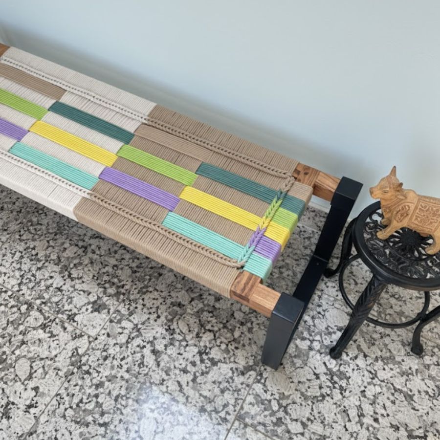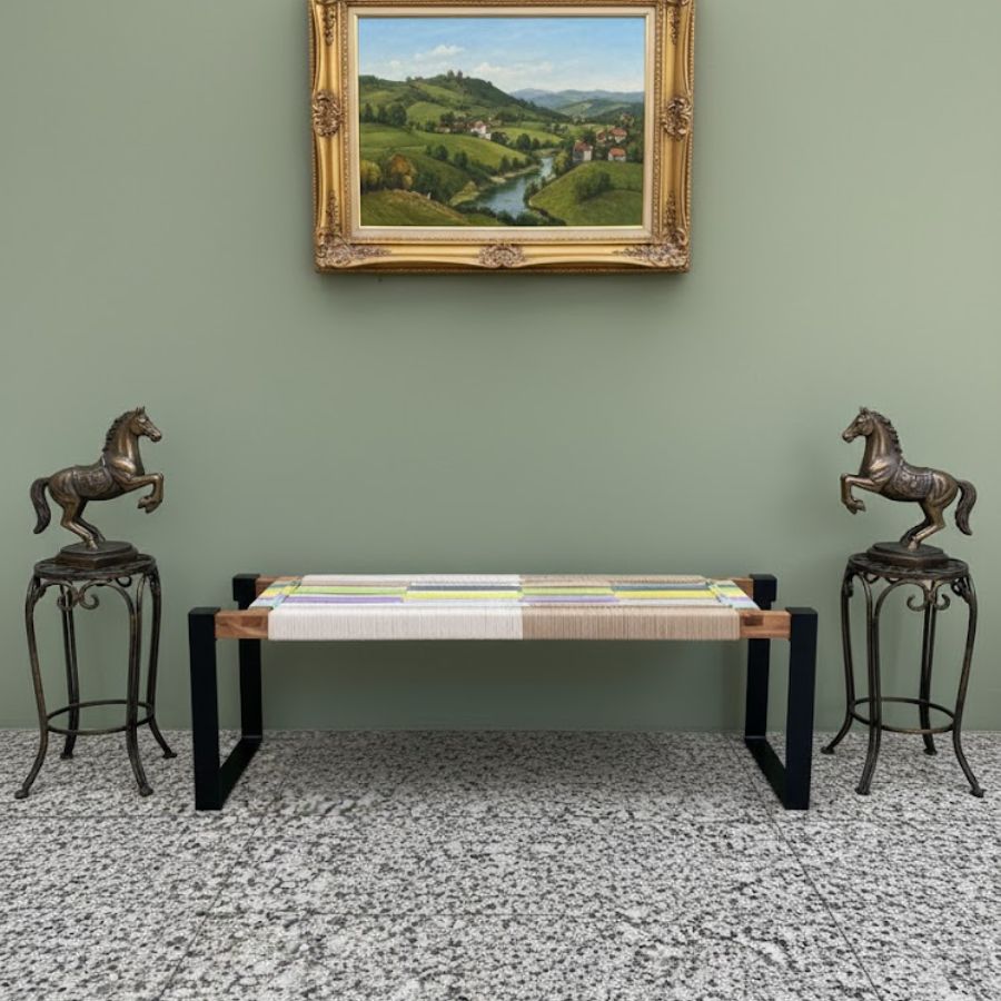 This Keats Solid Wood Two Seater Woven Bench with Black Metal Legs (Multicolor) combines playful artistry with modern utility, featuring a handwoven seat in soft cotton cords with beige, white, green, purple, teal, and yellow hues. Supported by sturdy black-coated metal legs and a solid wood frame, it adds sculptural charm and durable function to entryways, living rooms, bedrooms, or offices. Its minimalist lines and multicolored weave make it perfect for vibrant décor settings or as a striking accent in contemporary homes.