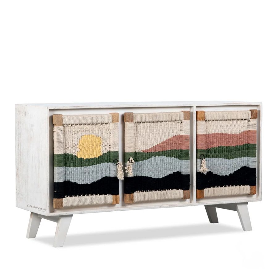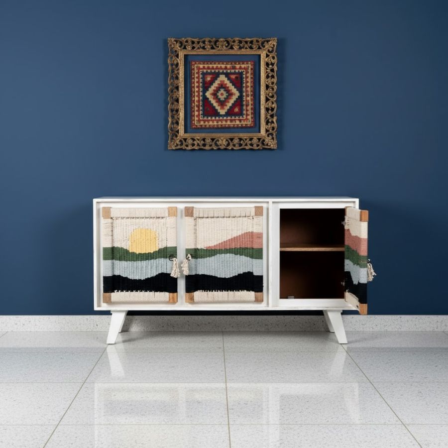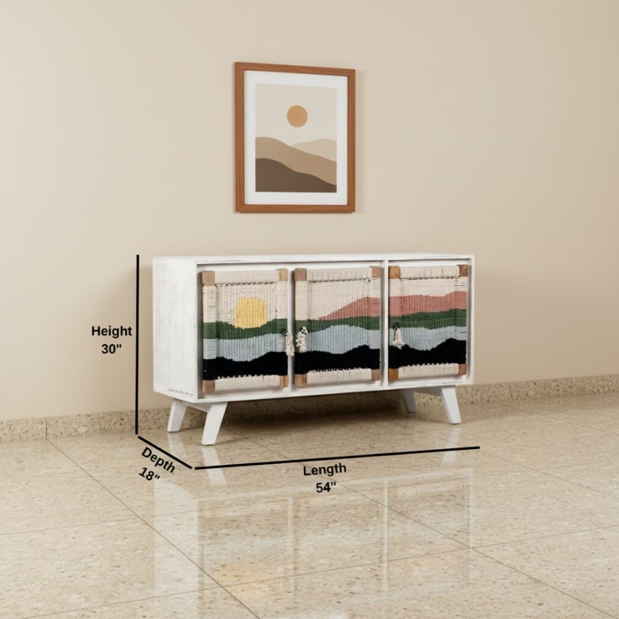 The Kipp Three Door Solid Wood Handwoven Sunset Art Design Sideboard Cabinet (White) in White Color from Furnshine is a stylish blend of artisanal craftsmanship and modern utility. Its doors feature handwoven cotton panels with a serene landscape design, set against a white color solid mango wood frame. Spacious storage and sturdy legs make it practical for living, dining, or bedroom spaces, while the woven sunset motif adds a touch of bohemian warmth. This sideboard is perfect for those seeking uniqueness and quality, merging sustainable materials and eye-catching design for contemporary homes.