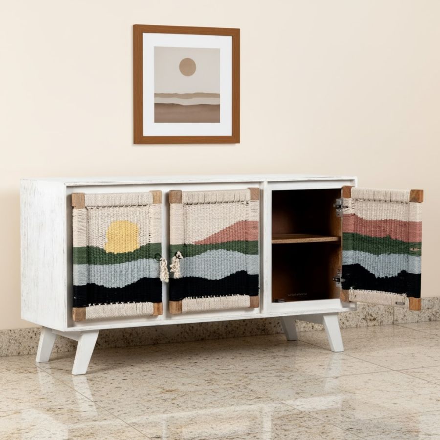 Furnshine – Kipp Three Door Solid Wood Handwoven Sunset Art Design Sideboard Cabinet (White)