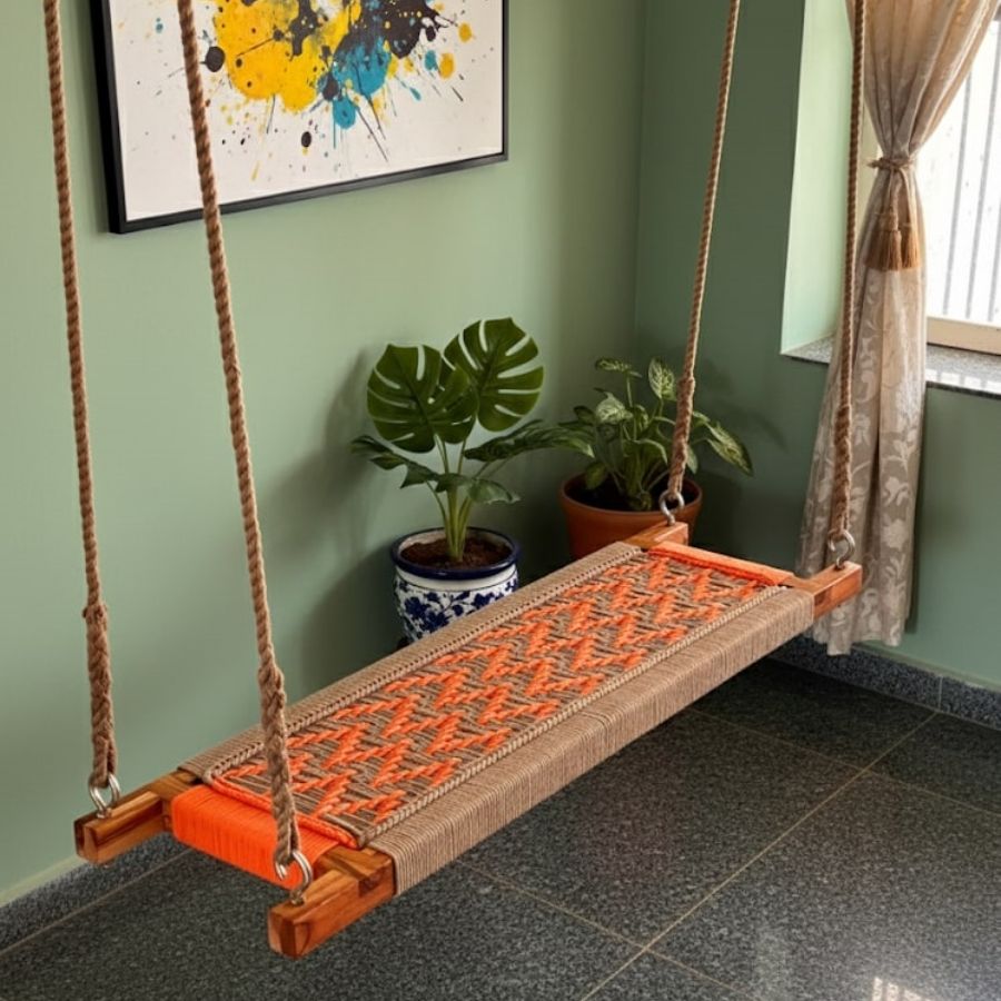 The Lathan Hand Woven Swing for Adults & Kids offers outstanding comfort, quality, and a lively design with its earthy brown and vibrant orange weave. Crafted from sustainably sourced Acacia wood and eco-friendly, abrasion-resistant hemp rope, this swing provides lasting durability and a supportive seat for both adults and kids. The intricate woven pattern highlights the artisanal craftsmanship, making it a striking piece for porches, balconies, or indoor corners. Designed for easy installation, this swing blends playful color with traditional strength to enrich any home.