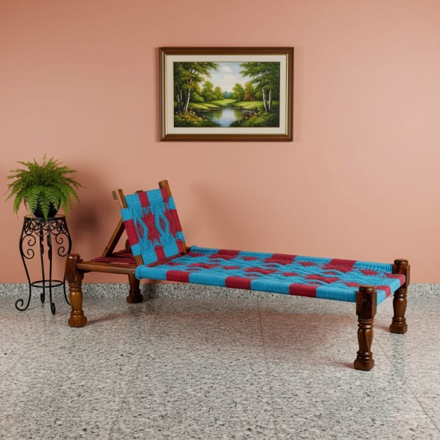 This Locke Solid Sheesham Wood Handwoven Charpai with Backrest (Blue & Red), woven in vibrant blue and red patterns, perfect for both lounging and contemporary décor. Designed for indoor and outdoor use, this charpai/Khatiya is made from sturdy wood and durable weaving material to ensure long-lasting comfort and style. Its lightweight yet robust construction makes it easy to move, while the elevated design adds a traditional touch to modern spaces. Ideal for bedrooms, living rooms, patios, or gardens, this versatile lounger brings a blend of cultural charm and functional seating to any home.