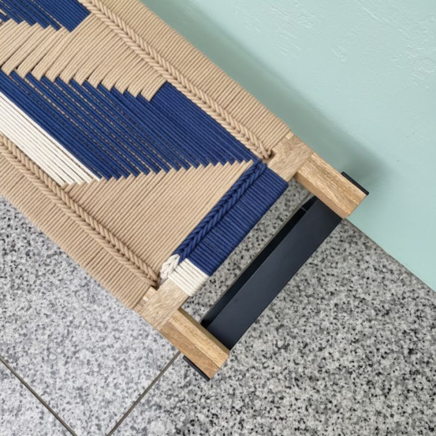 Furnshine – Mace Two Seater Woven Bench with Black Metal Legs (Beige, Blue & White)
