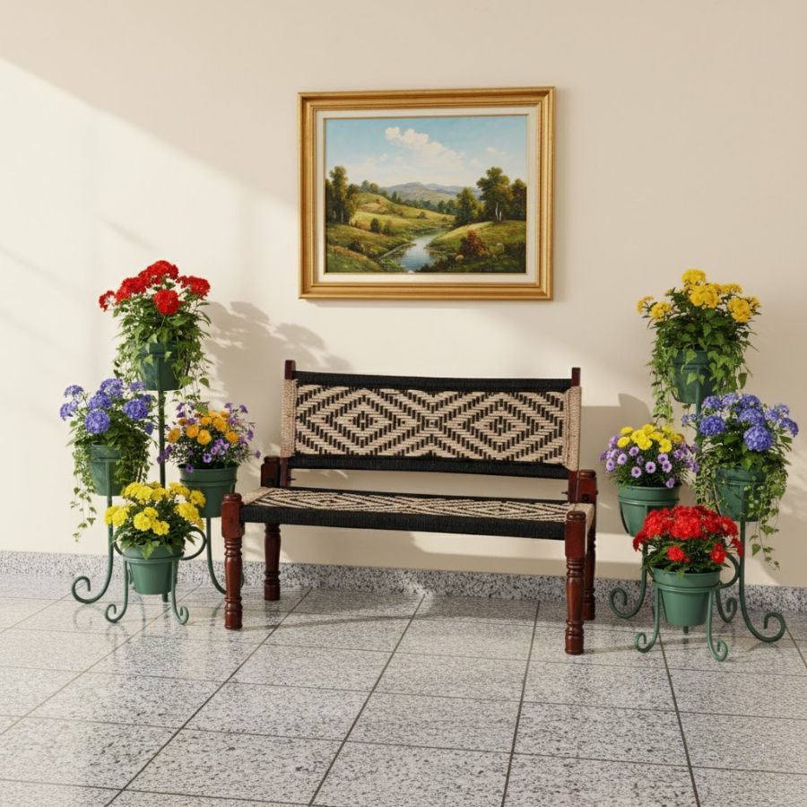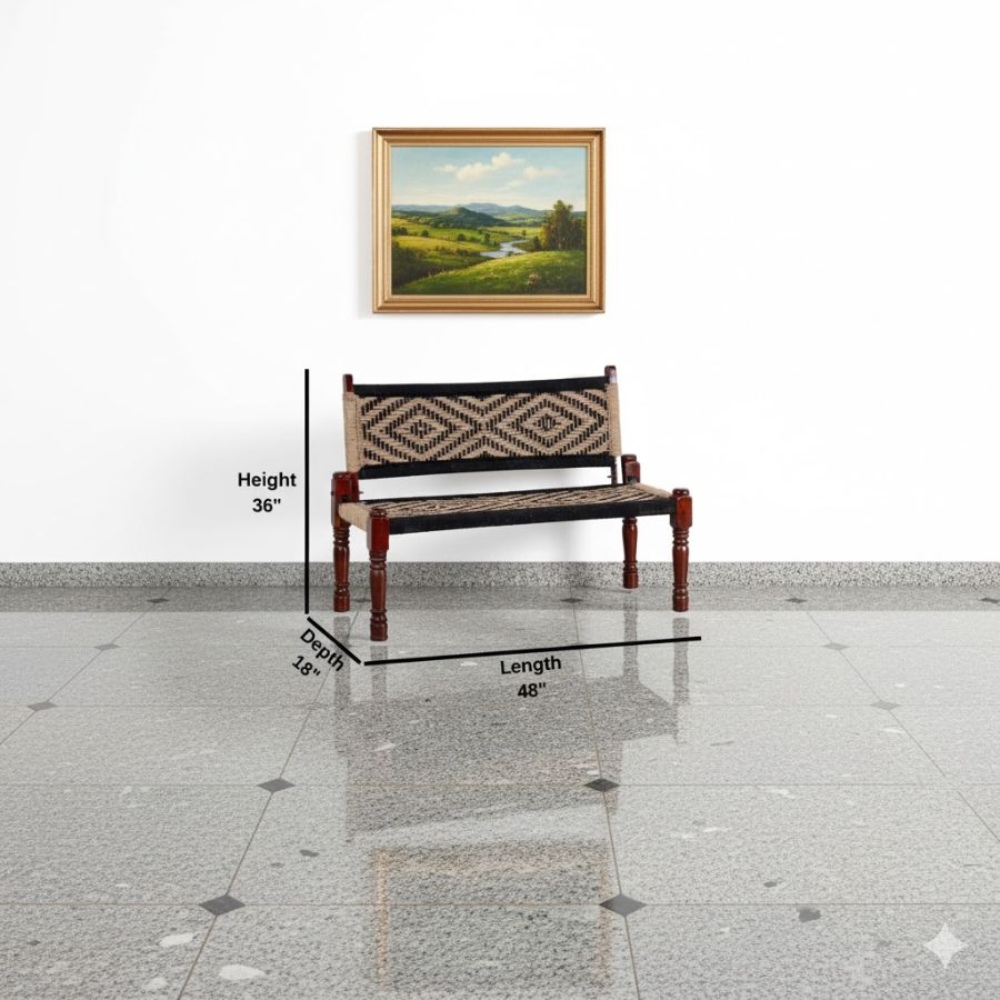 This Maxfield Solid Wood Handwoven Backrest Bench (Black & Jute) blends rustic charm with modern style for any indoor or outdoor space. Featuring solid seasoned wood and a striking woven jute rope pattern in black and natural tones, it provides both comfort and visual appeal. The sturdy frame ensures lasting durability, while handcrafted details highlight skilled Indian artistry. Ideal for patios, entryways, or living rooms, it serves as a cozy seating option and a statement accent. Easy to maintain and versatile, this bench is perfect for relaxing, entertaining, or elevating home decor with a touch of tradition and sophistication.