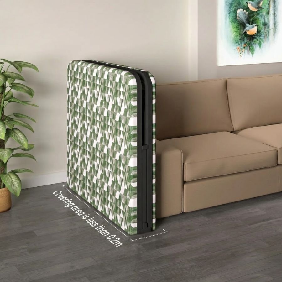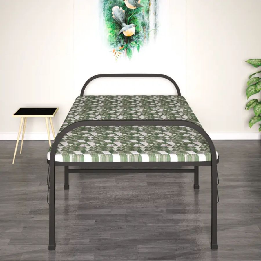 Upgrade your sleeping space with this Furnshine sturdy metal folding bed with firm mattress, designed for everyday comfort and long-lasting durability. Crafted from a strong metal frame with a sleek black finish, this single bed offers excellent support while maintaining a compact, space-saving design. The included firm mattress with Green printed fabric upholstery ensures balanced comfort for a restful night’s sleep, making it ideal for daily use, guest rooms, hostels, or rented homes.