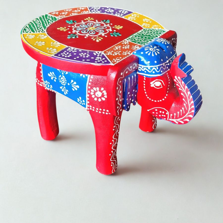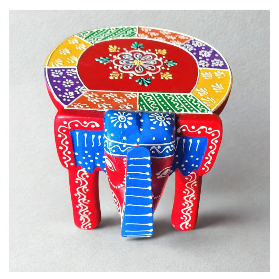Add a vibrant touch of Indian heritage to your space with this Wooden Elephant Stool – Multicolor Design, a beautifully handcrafted décor piece inspired by traditional folk art. Made from solid, high-quality wood, this charming stool features a bold red base adorned with intricate hand-painted patterns in blue, yellow, green, white, and purple. The detailed motifs on the elephant’s body and the decorative tabletop reflect skilled artisan craftsmanship and Rajasthani cultural aesthetics. Symbolizing wisdom, strength, and prosperity, the elephant form makes this stool not just a functional accent but also an auspicious addition to your home. Compact yet sturdy, it can be used as a low seating stool, side table, or decorative stand for idols, diyas, plants, or showpieces. Ideal for pooja rooms, living areas, foyers, or ethnic-themed interiors, this multicolor elephant stool effortlessly blends utility with timeless Indian artistry.