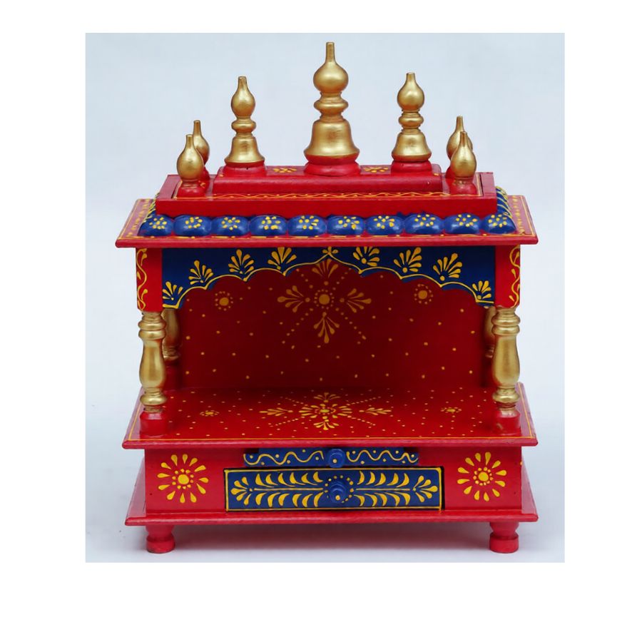 Furnshine – Red Hand-Painted Solid Wood Home Temple Mandir with Drawer for Home & Office Pooja