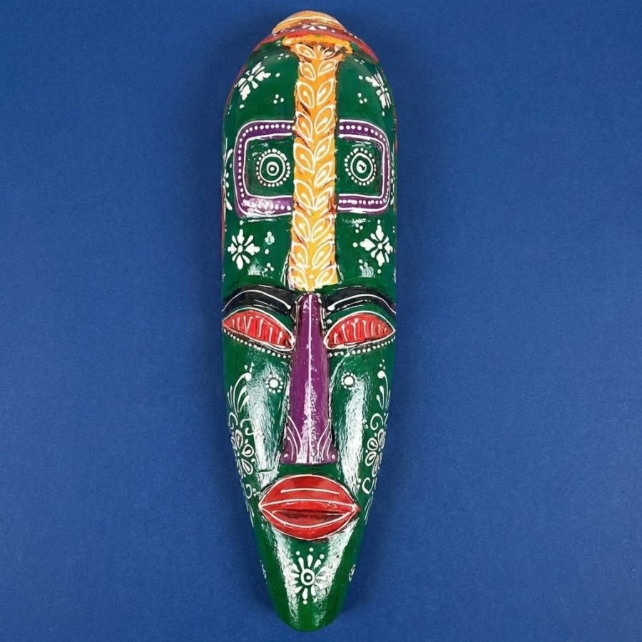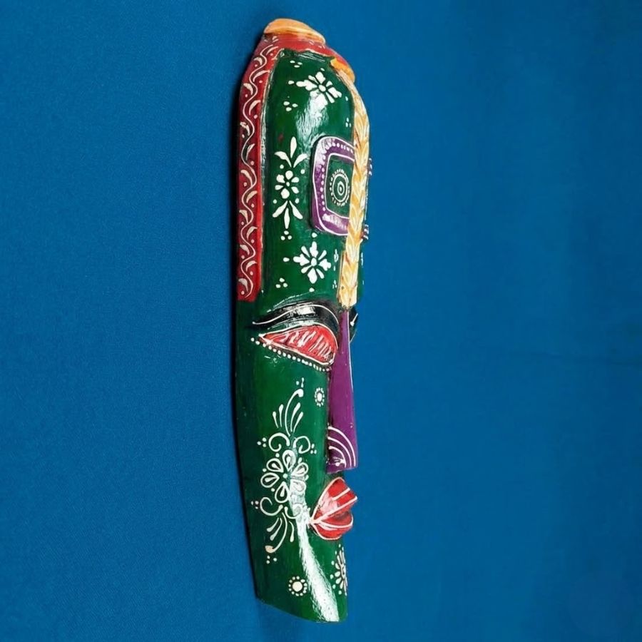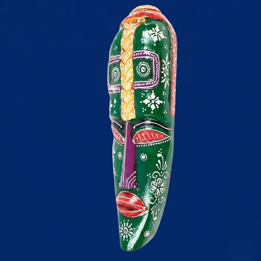 Discover the enchanting Nazar Battu Wall Mask, an 18-inch handcrafted wooden tribal masterpiece from Furn Shine that fuses African and Egyptian artistry. Its dominant green elongated face boasts vivid purple eyes, orange crest, red lips, and delicate white motifs, designed to ward off evil eyes while elevating decor. Measuring 13cm wide, 5cm deep, and 45cm tall at 660g, this lightweight piece suits entrances, living rooms, doors, hallways, or balconies. Artisan-carved in India with premium wood and non-toxic paints, each mask offers unique character for ethnic, rustic, or modern spaces. Easy wall mounting included. Wipe clean with a dry cloth. Ideal for housewarmings or gifts, it brings cultural depth and positive vibes.