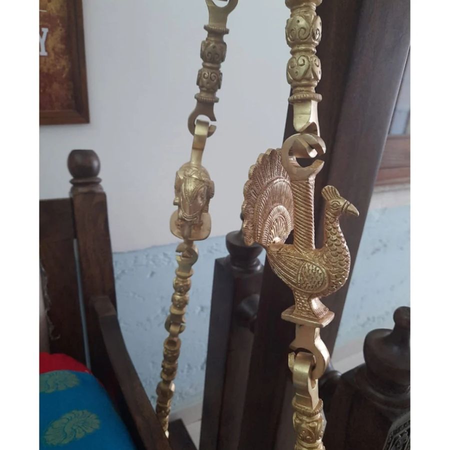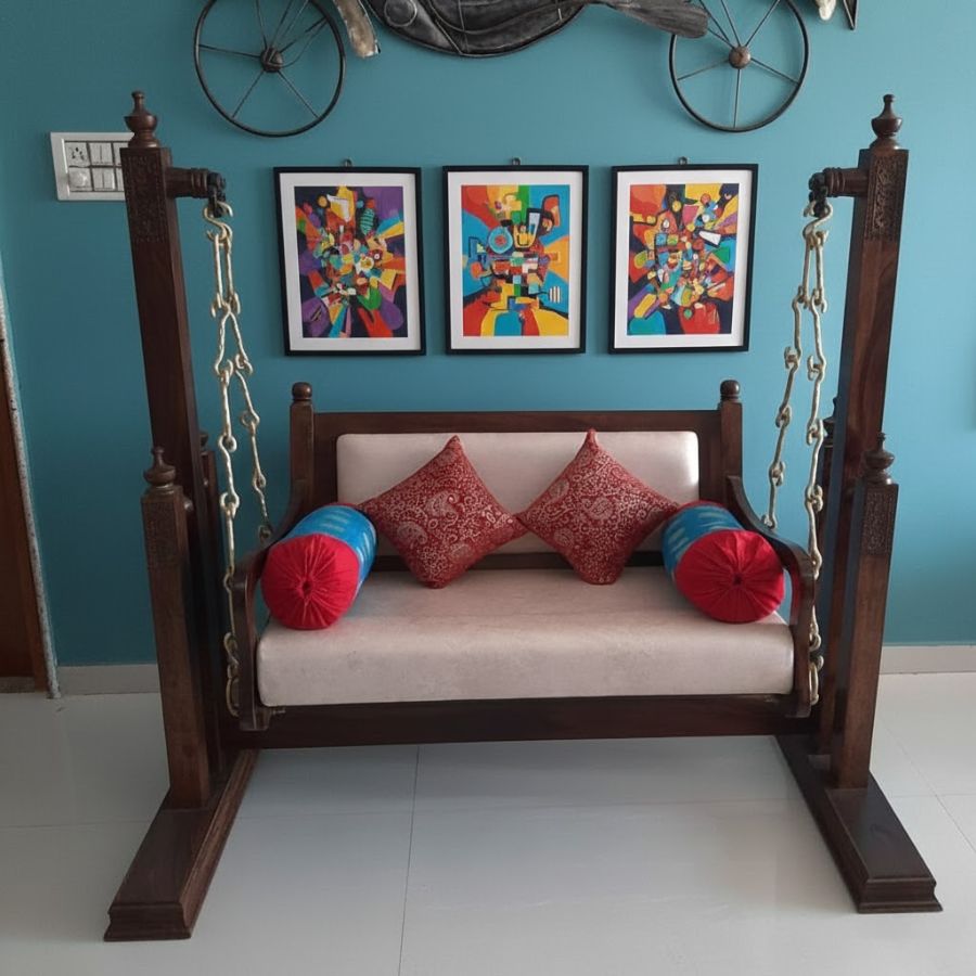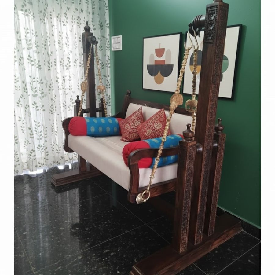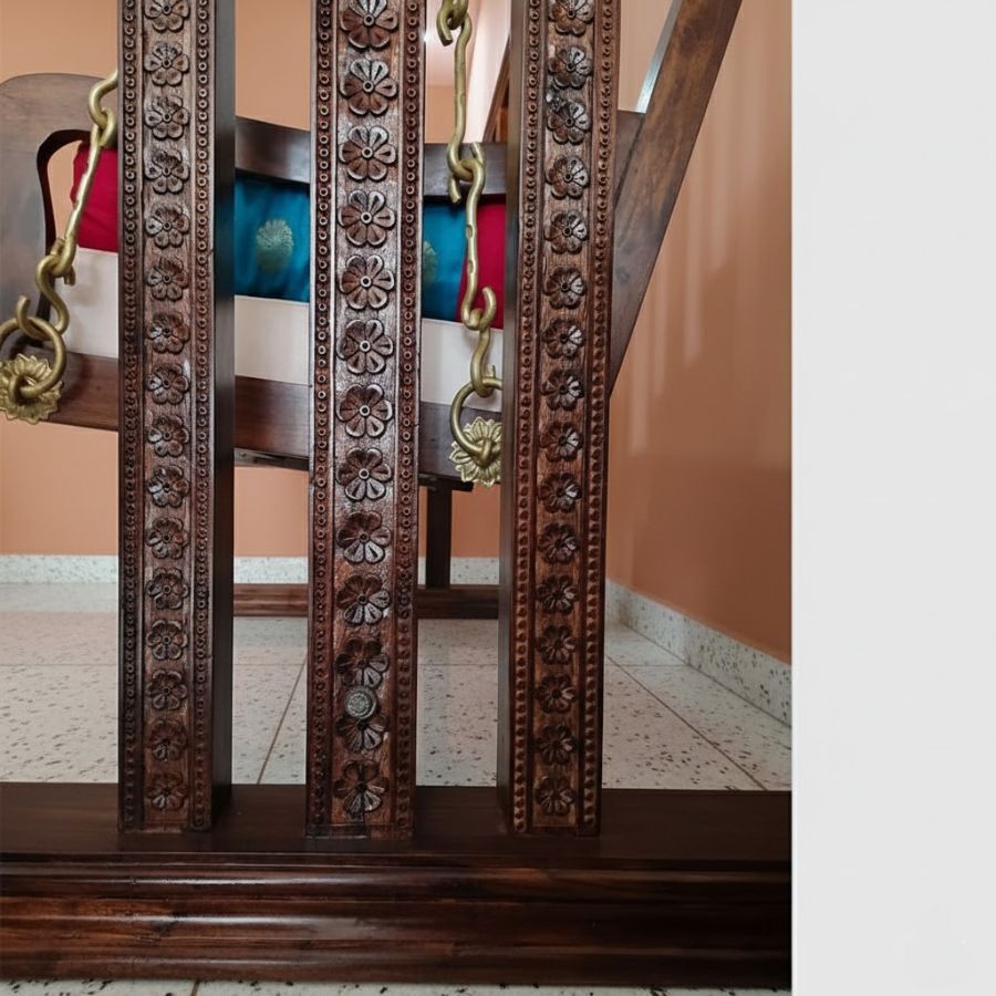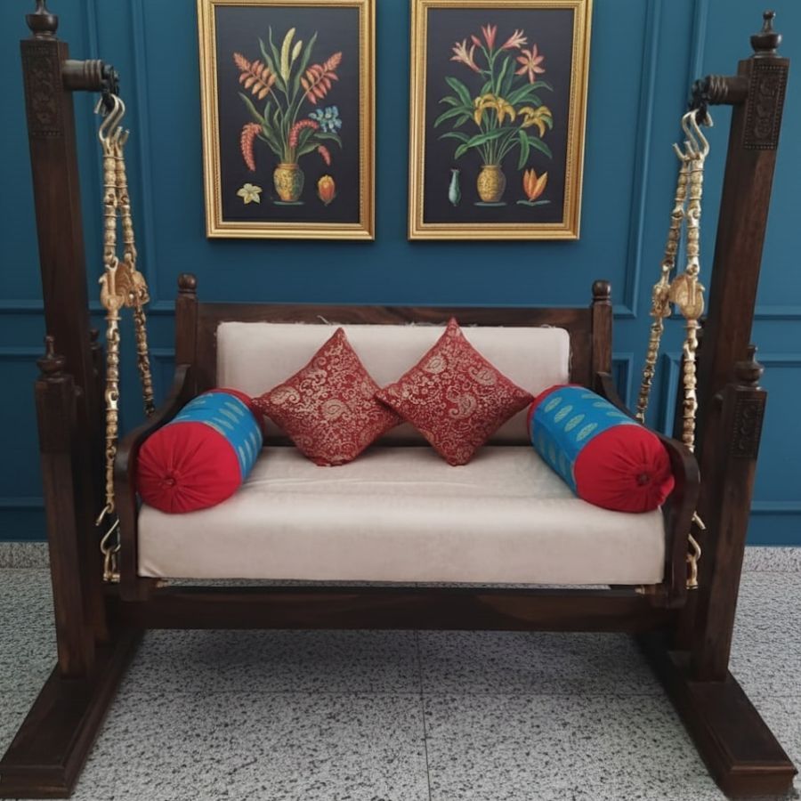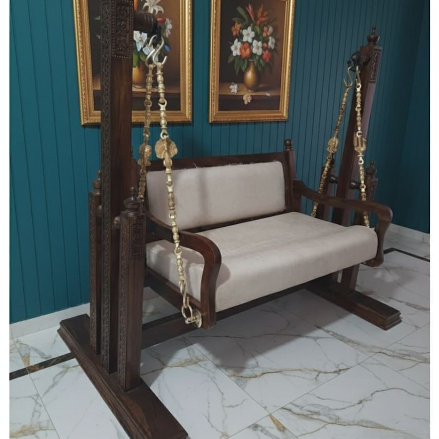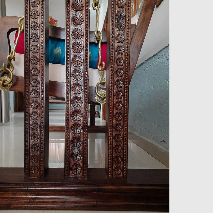 The Nelly Sheesham Wood Freestanding Swing with Brass & Iron Chains offers a majestic centerpiece for any living room, hallway, or covered outdoor space, blending intricate Sheesham wood carving with robust craftsmanship for lasting presence and beauty. Finished in rich walnut polish and suspended by ornate brass chains, this swing comes complete with plush mattress and pillows, ensuring a luxurious lounging experience. Engineered for smooth motion and stable leg support, it’s ideal for those who appreciate classic Indian elegance paired with everyday comfort and versatility.