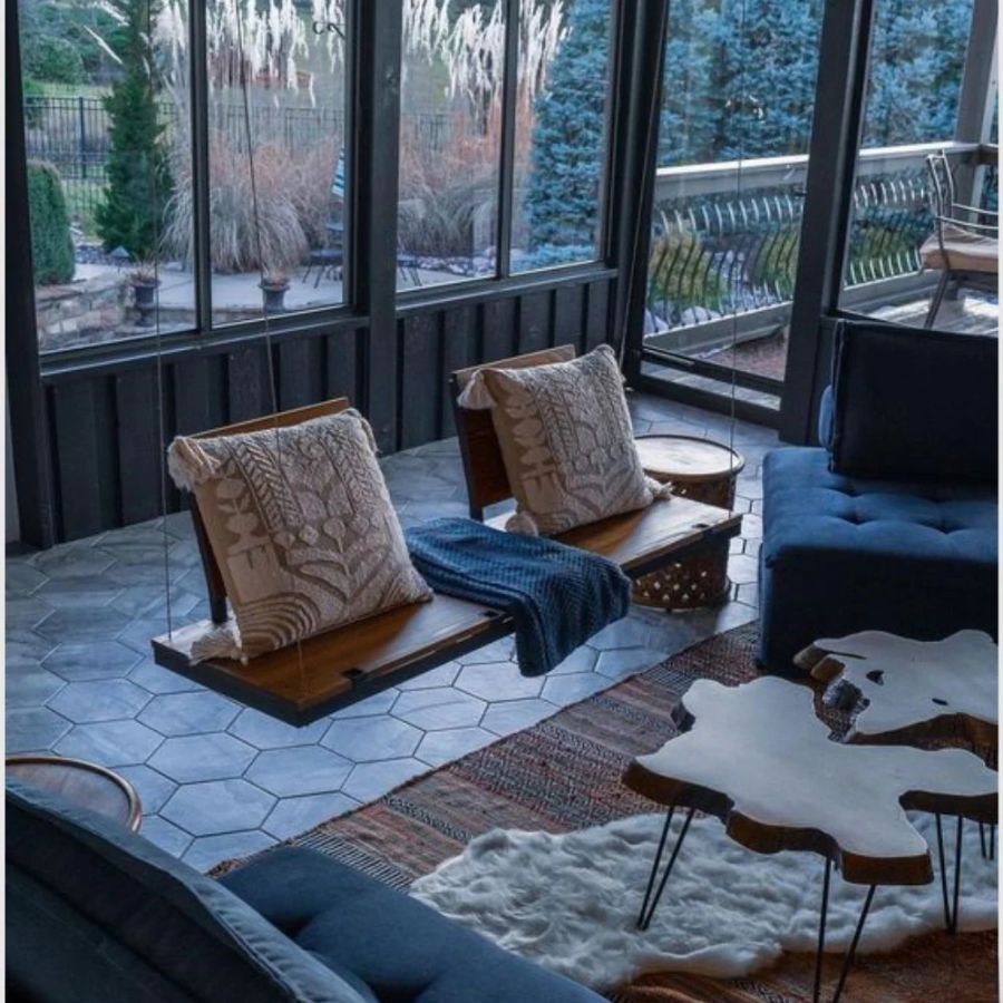 This Odele Solid Sheesham Wood Swing Chair features a breakthrough modular design with 5+ backrest configurations, effortlessly adapting to solo relaxation or sociable moments. Expertly crafted from premium solid wood and industrial metal, the swing offers both durability and style for indoor and outdoor settings. Its adjustable backrests create versatile seating arrangements—facing inward for conversation or outward for tranquil views—making it a perfect modern centerpiece for balconies, patios, or living rooms. The spacious plank seat ensures comfort, while easy-clean surfaces and a sleek, contemporary aesthetic elevate any space.