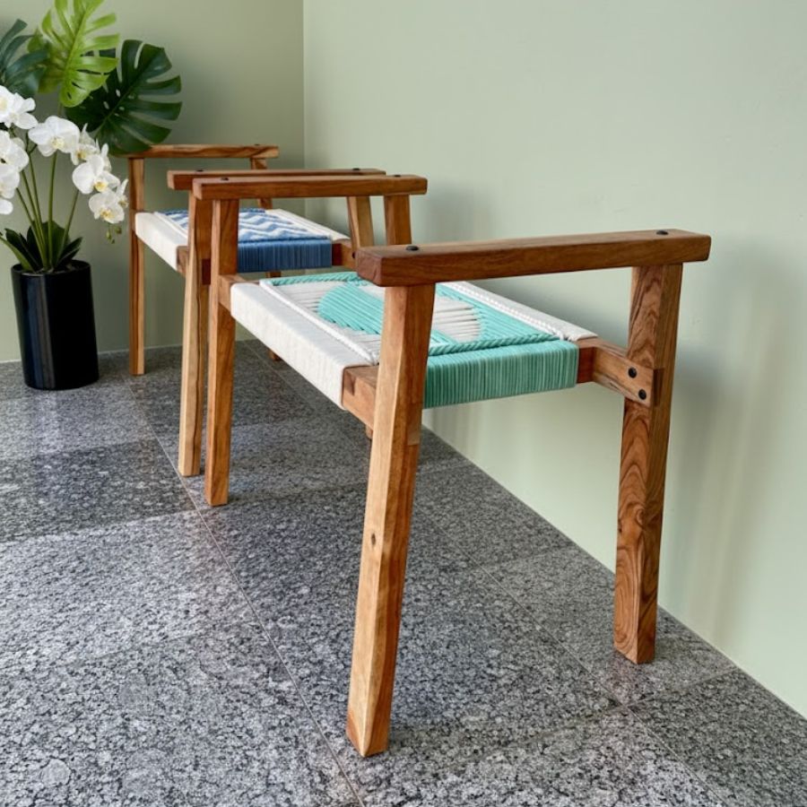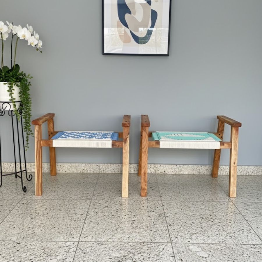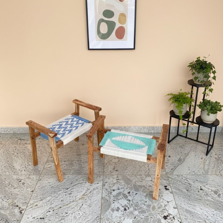 This Odell Set of Two Solid Wood Hand Rest Woven Stool (White, Blue & Teal) combines sculptural artistry and everyday function, making a statement in any modern home. Crafted with solid, chemically treated wood and woven with premium 4 mm cotton cord in soothing white, teal, and blue tones, these stools offer both comfort and durability. Their contemporary design fits beautifully in bedrooms, living rooms, balconies, gardens, and offices. Lightweight yet sturdy, they’re easy to assemble and perfect for both decorative and practical seating needs.