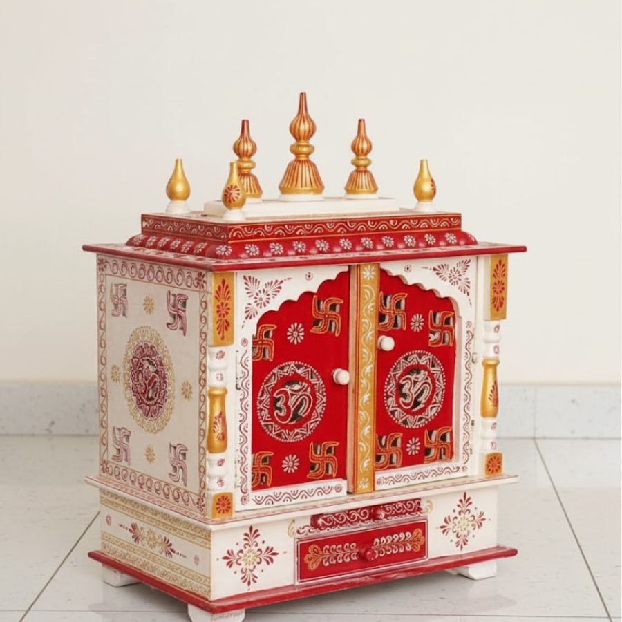 Handcrafted wooden pooja mandir in red and white finish with gold accents.