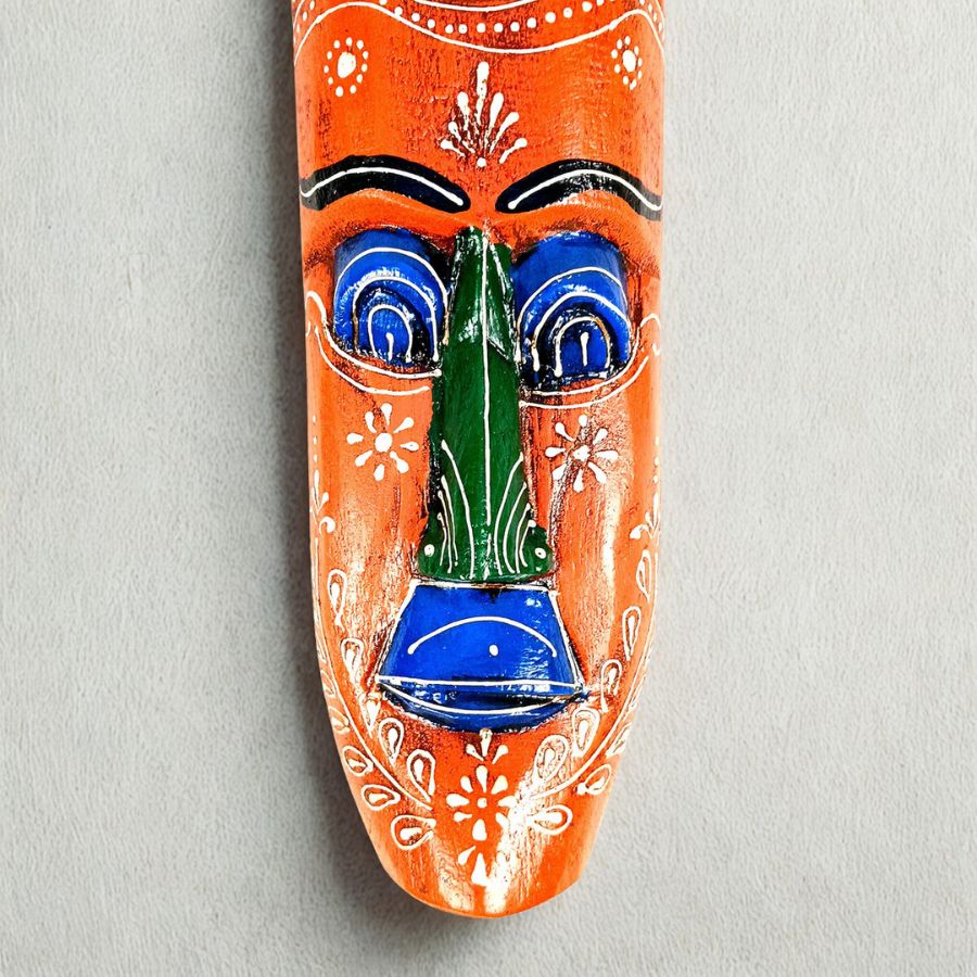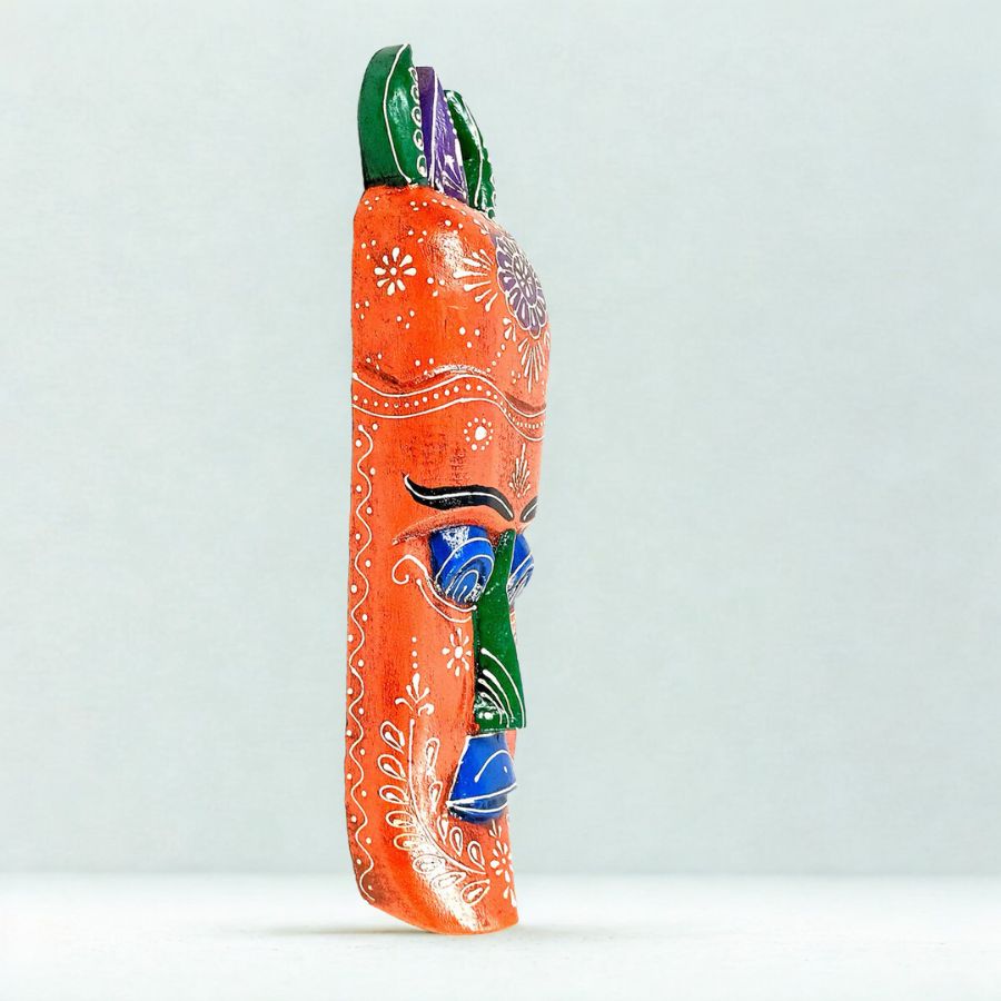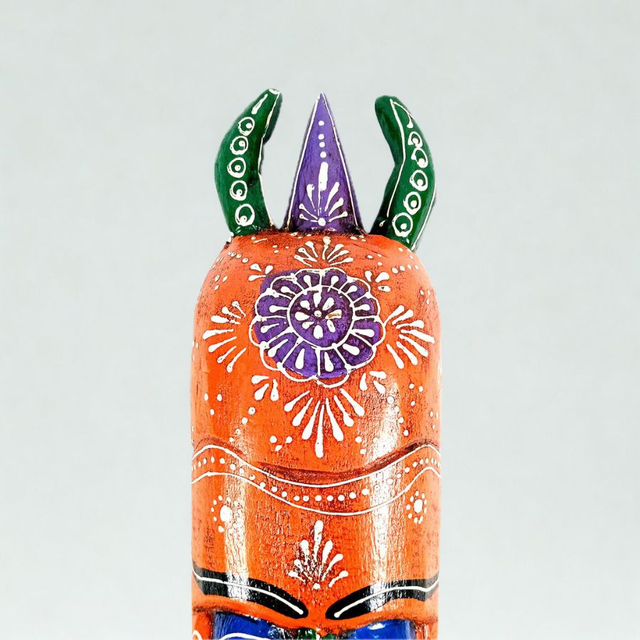 Handcrafted wooden mask with orange body, purple horns, green/blue accents.