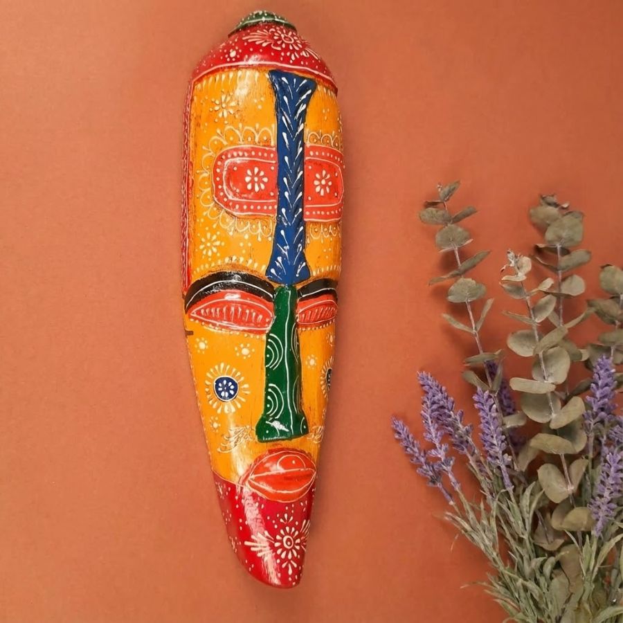 Transform your walls into a canvas of cultural mystique with this Furn Shine African Egyptian Face Wall Mask Hanging, a handcrafted wooden masterpiece measuring 18 inches (45 cm) tall, 5 inches (13 cm) wide, and 2 inches (5 cm) deep. Weighing just 660 grams, its lightweight design ensures effortless mounting on entrances, living rooms, hallways, doors, or balconies, while concealing minor wall imperfections like old paint or nails. Vibrant hand-painted motifs in red, orange, yellow, green, and blue capture tribal artistry, serving as Nazar Battu to ward off negative energies and invite positivity. Ideal for home decor or gifting, this single mask adds antique elegance to modern or ethnic interiors without floor space demands. Preserve its allure by wiping with a dry cloth—crafted uniquely by artisans for one-of-a-kind charm.