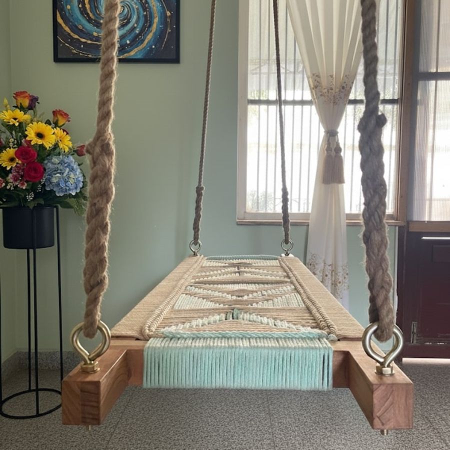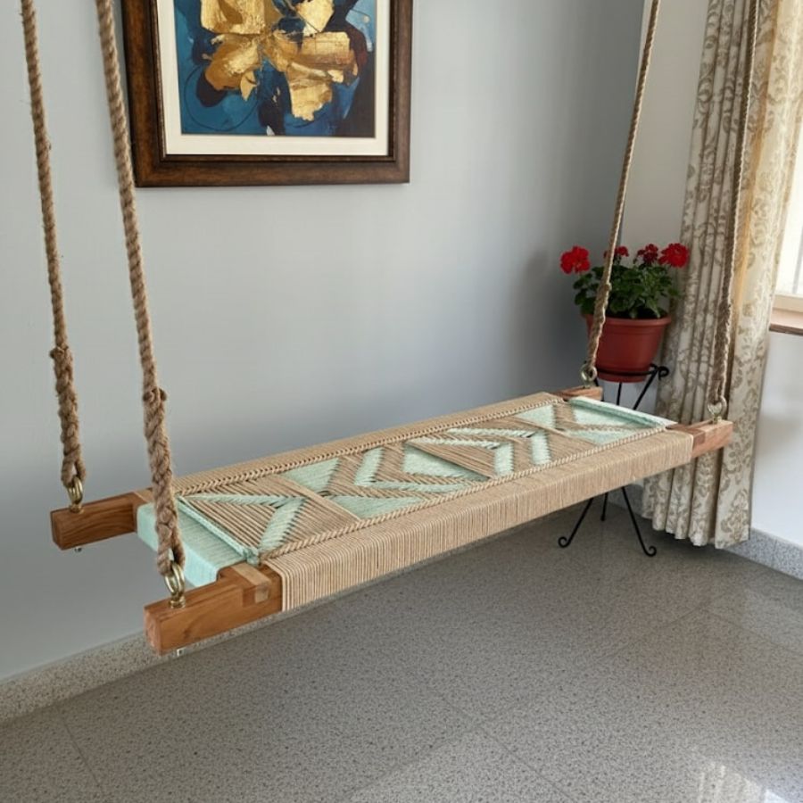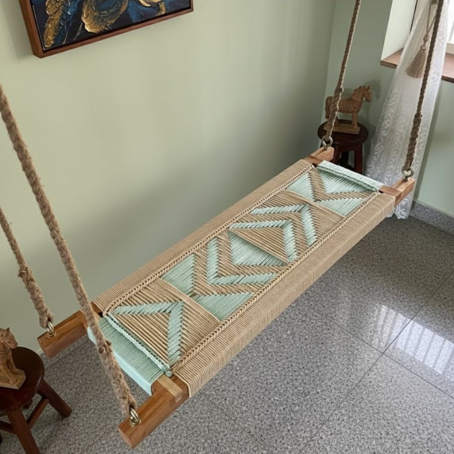 Experience the charm of handcrafted luxury with the Pat Geometric Woven Swing for Kids & Adults (Beige & Pastel Green). This swing features a sturdy Acacia wood frame with beautifully braided beige and pastel green rope, creating a soothing and elegant look perfect for any indoor or outdoor space. Designed for comfort, safety, and long-lasting use, it supports both adults and kids with ease. The eco-friendly materials and artisan craftsmanship offer superior strength and a natural vibe. Easy to install and maintain, this stylish swing brings relaxation and a touch of sophistication to your home, garden, balcony, or patio.
