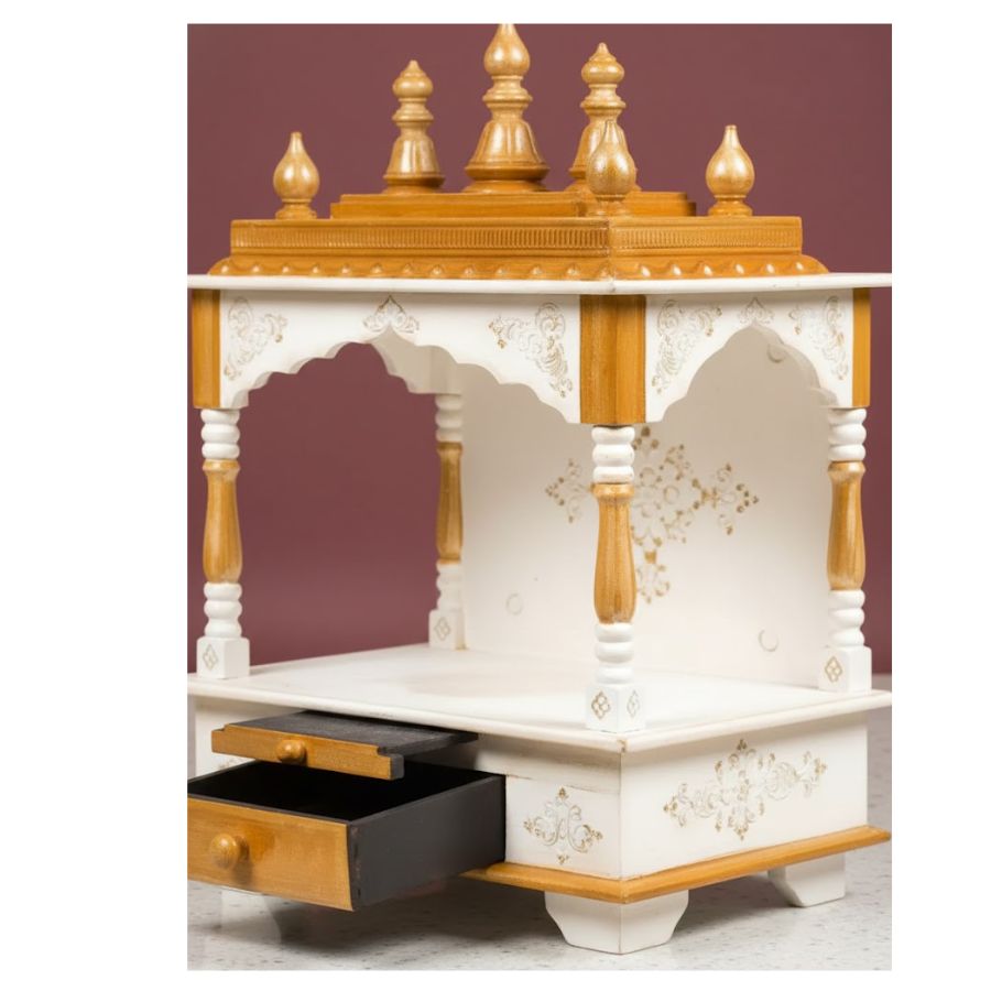 Furnshine – Rajasthani Arts White & Gold Solid Wood Home Temple with Drawer, Compact Tabletop Pooja Mandir for Home and Office.
