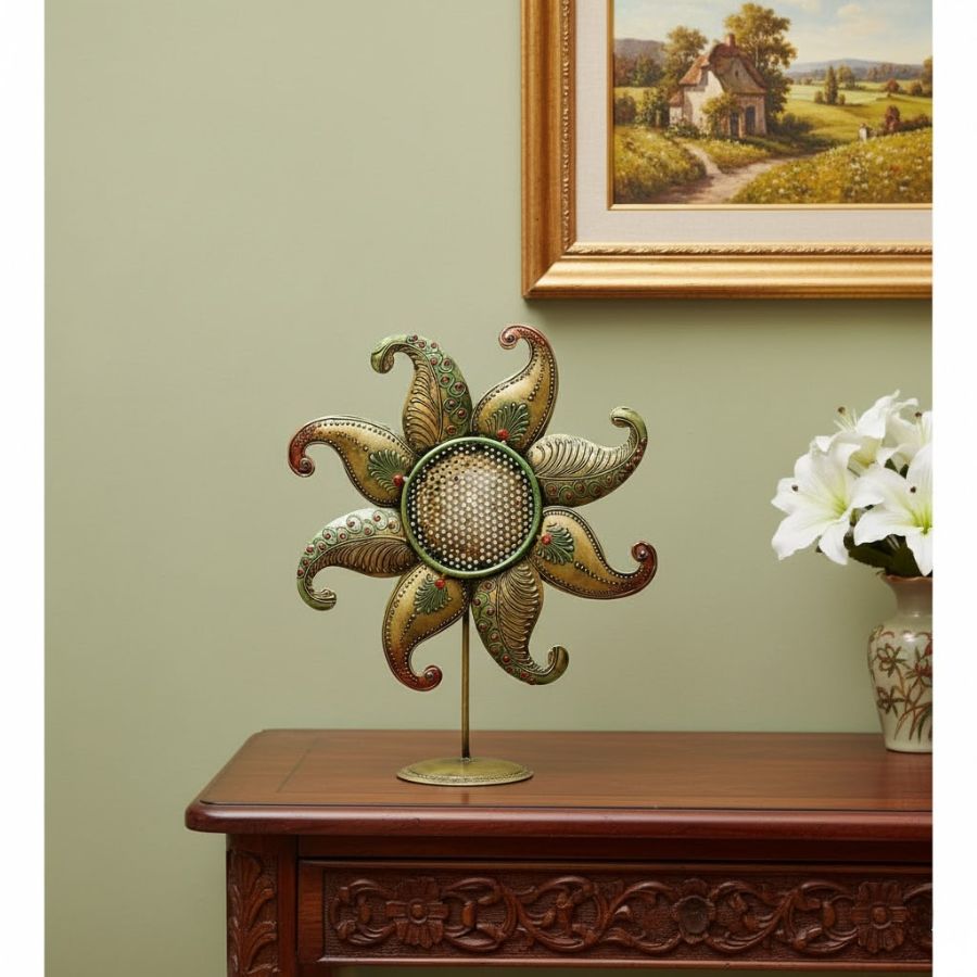 Elevate your décor with the FURNSHINE Ridley Handcrafted Artistic Sun Tabletop Decor – Multicolor Metal Cutwork Indian Home Accent Showpiece. Expertly designed from durable metal, this vibrant sunburst showpiece features intricate multicolor hand-painted details and delicate cutwork at the center, casting beautiful patterns of light and adding a festive Indian touch. Ideal for living rooms, offices, or gifting, it blends traditional artistry with modern flair while standing firmly on any tabletop. Its radiant design brings warmth, positivity, and a unique artistic statement to any space.