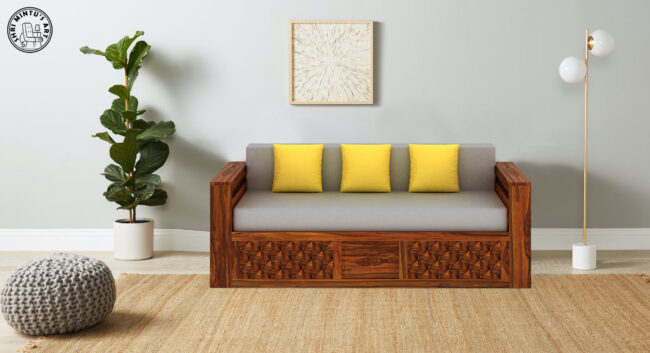 Furnshine – Riggan Solid Sheesham Wood 3 Seater Sofa Cum Bed with Mini Storage and Side Pockets