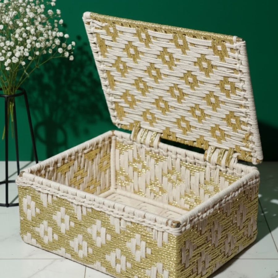 The Ripley Eco-Friendly Handwoven Ivory & Metallic Gold Storage/Gift Box from Furnshine beautifully blends earthy tones with golden accents, showcasing the elegance of traditional handwoven craftsmanship. Made using eco-friendly fibers, this artisanal box features a sophisticated ivory-and-gold geometric pattern that adds a premium festive charm. Its spacious design is ideal for curating hampers, gifting accessories, storing trinkets, or presenting festive essentials. Perfect for weddings, Diwali gifting, housewarmings, and special celebrations, this box elevates any occasion with its natural aesthetic and cultural richness. Durable, stylish, and multifunctional, it brings timeless elegance to both gifting and home décor.
