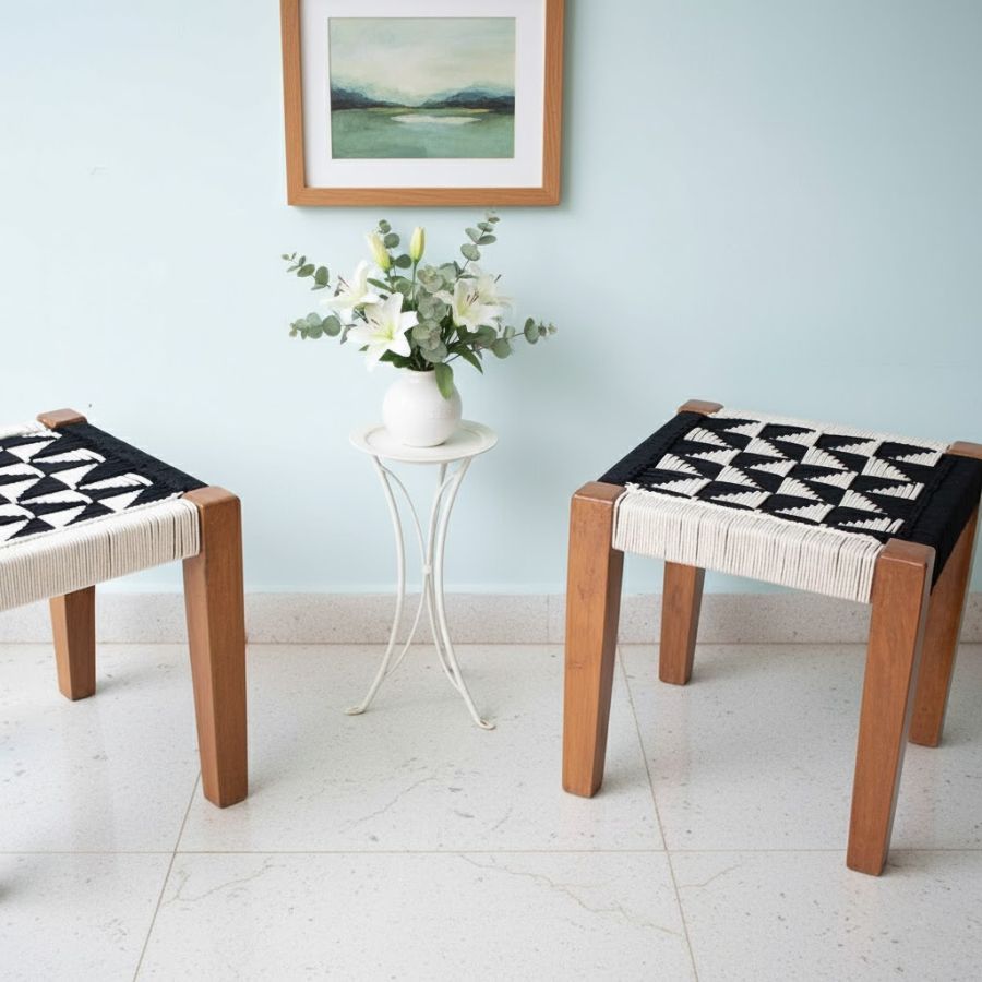 This Royston Solid Sheesham Wood Black & White Handwoven Stool from Furnshine is a handwoven accent piece crafted from black and white cotton ropes, set atop a solid wood frame. Its striking monochrome pattern and compact design make it perfect for any room—be it your living space, bedroom, or balcony. Lightweight yet sturdy, this stool adds a touch of contemporary craftsmanship while serving as extra seating or a unique decor element. Ideal for both indoor and sheltered outdoor use, it’s easy to maintain with just a dry cloth, offering sustainable style for modern homes.