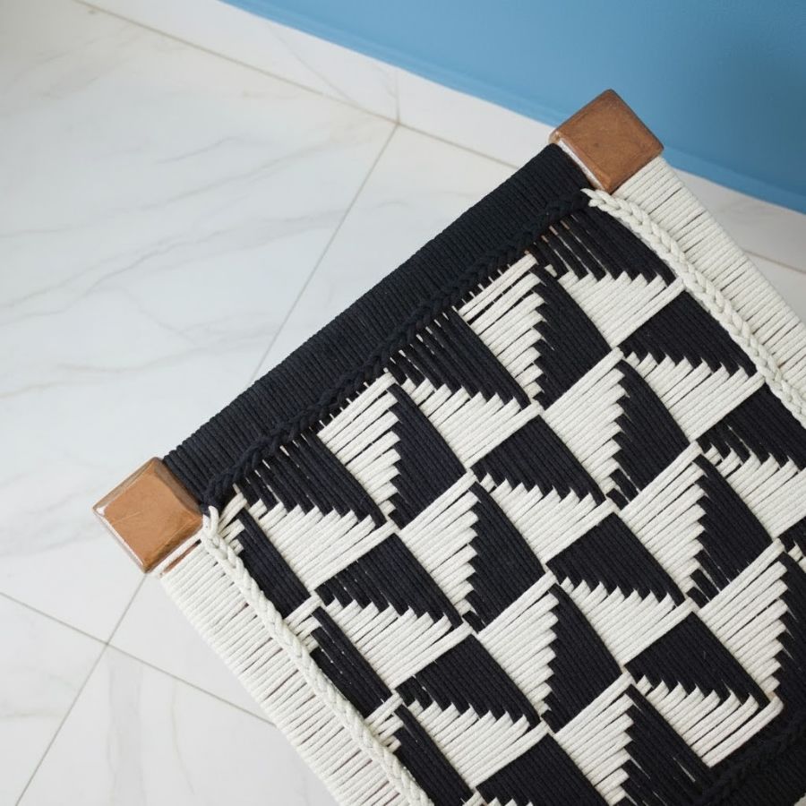 Handwoven cotton rope seat in black and white geometric design