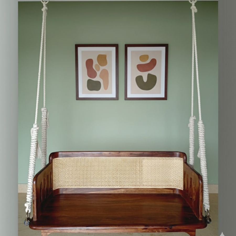 Elevate your interiors or porch with the Ryland Solid Wood & Rattan Swing—a perfect fusion of robust Sheesham wood and handwoven cane artistry. Designed for both hanging and floor use, this swing brings warmth, function, and style to modern homes. With strong side arms, rounded corners for child safety, and a rich honey finish, it ensures everyday resilience and sophistication. Crafted by skilled artisans using premium, seasoned timber and hand-waxed polish, it stands as a timeless example of contemporary Indian craftsmanship, adaptable for living rooms, porches, hallways, or bedrooms.