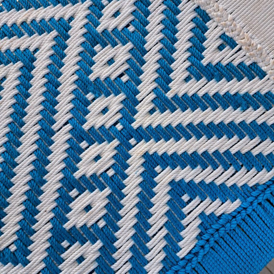 Woven with eco-friendly, durable hemp rope in beige and light blue.