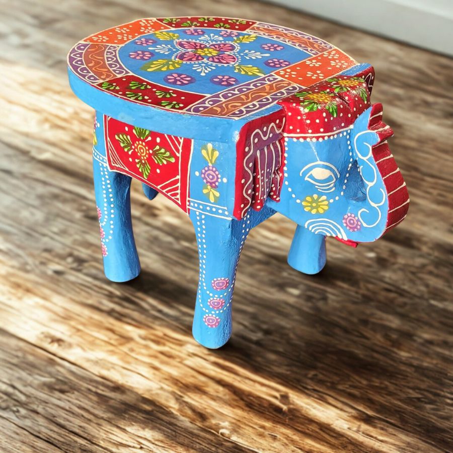 Furnshine – Sky Blue Design Wooden Elephant Stool – Indian Handicraft Home Decor, Pooja & Foyer (8″H x 10.5″L x 8″W)