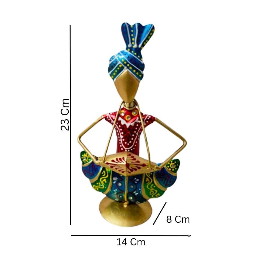 Bring vibrant Rajasthani culture into your home with this Sly Handcrafted Multicolor Rajasthani Musician Figurine Set – Traditional Metal Showpiece for Table & Home Decor (Set of 3) from FURNSHINE. Each handcrafted piece is made from durable metal and painted in bold, festive hues, capturing traditional folk musicians in mid-performance. These showpieces are ideal for table decor, shelf accents, or gifting, adding a lively and artistic touch to any setting. The intricate details and expressive postures reflect centuries-old artistry—perfect for those seeking unique, ethnic décor with cultural significance.