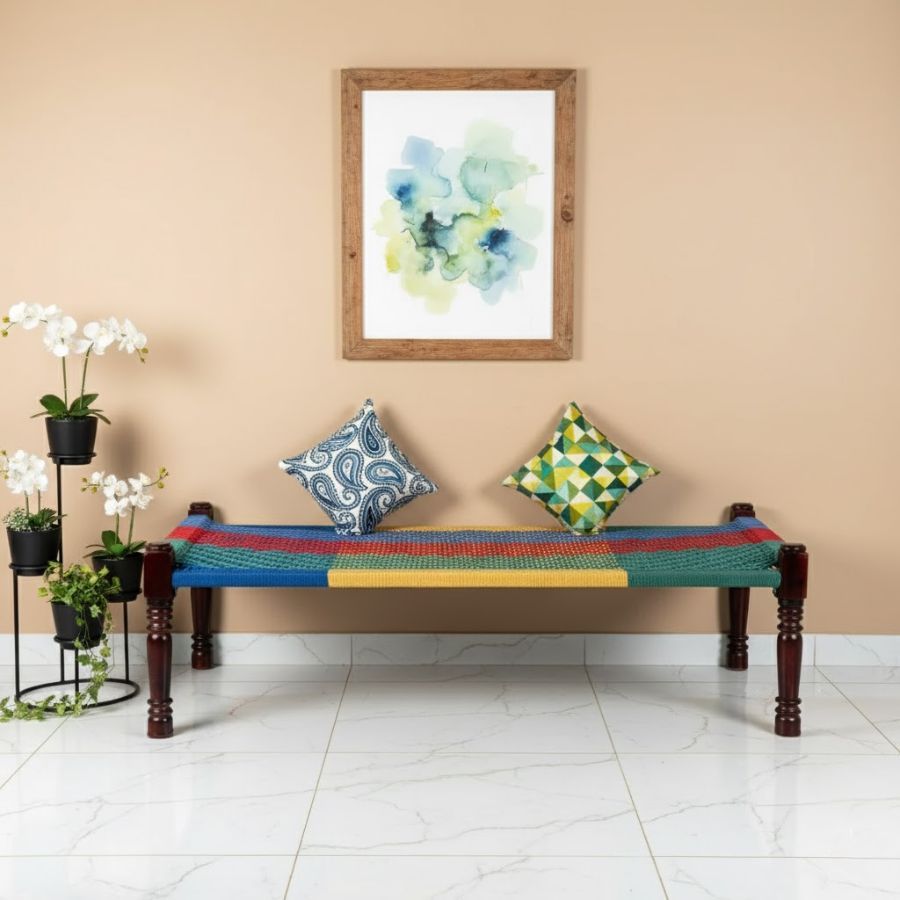 Experience vibrant Rajasthani artistry with this Sutter Solid Sheesham Wood Handmade Woven Charpai/Khatiya (Multicolor) by Furnshine. Handcrafted from durable Sheesham wood, the charpai/Khaat features a lively, handwoven cotton rope seat in bold blue, red, yellow, and green panels. Its sturdy yet lightweight build makes it perfect for use as a daybed or accent piece in living rooms, patios, or balconies. The playful color combination and time-honored construction add both comfort and a joyful splash of traditional Indian design to any space, seamlessly blending with modern and ethnic décor.