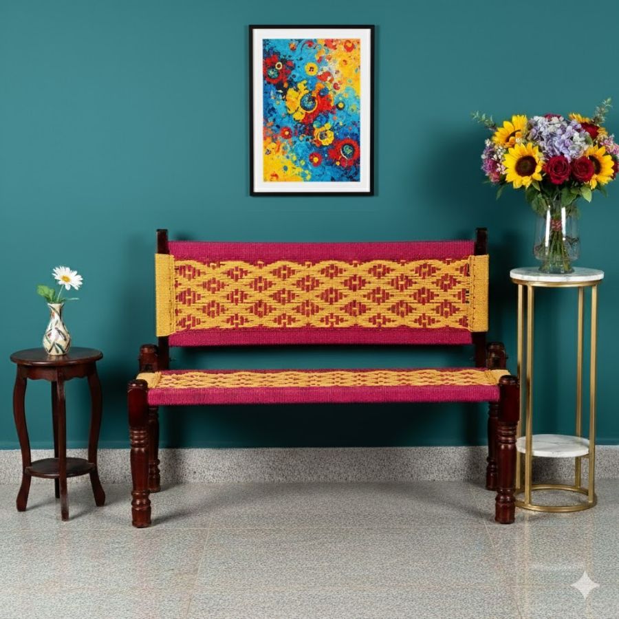 Brighten any space with the Swan Sheesham Wood Handwoven Backrest Bench (Pink & Yellow), featuring a vibrant pink and yellow geometric weave atop a sturdy Sheesham wood frame. Perfect for living rooms, patios, balconies, or entryways, this artisan-crafted bench blends traditional Indian design with modern durability. The supportive woven backrest and seat provide both comfort and style. Suitable for indoor or outdoor use, the bench boasts polished dark brown legs and excellent craftsmanship, making it a cheerful and functional addition to homes, offices, or hospitality spaces.