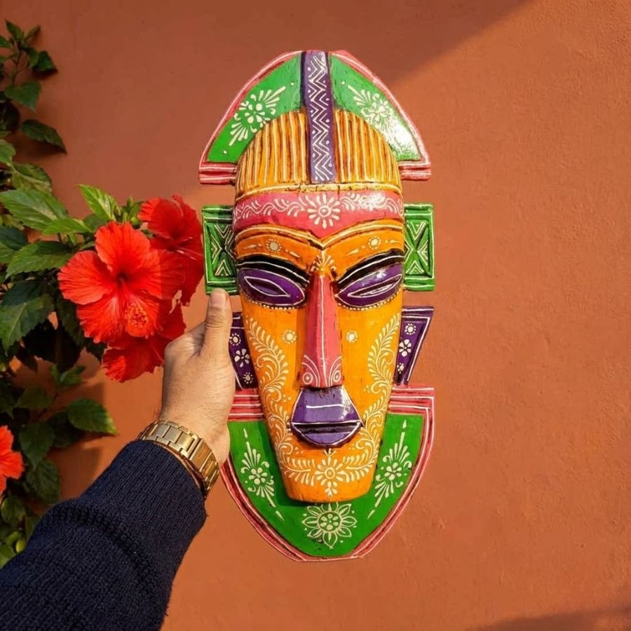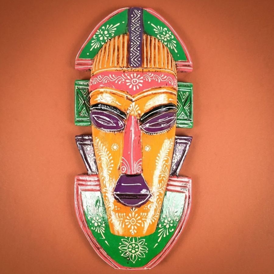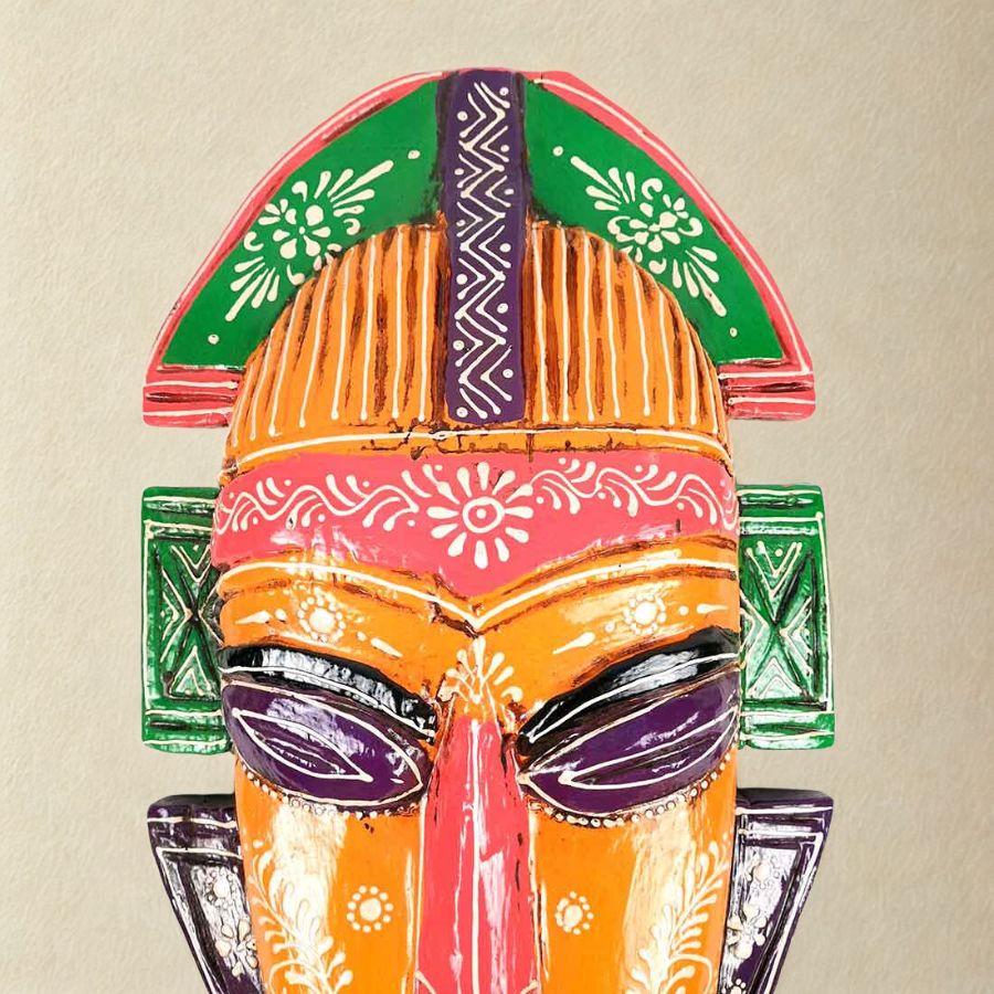 Transform your space with this 20-inch Tribal Mask Wall Hanging from Furn Shine, a masterpiece of Indian artisan craftsmanship in premium wood. Featuring an intricate design with orange base, bold purple eyes, pink highlights, and green geometric borders, it embodies Afro-tribal mystique and Nazar Battu protection. Ideal for home entrances, living rooms, hallways, or balconies, this lightweight piece measures 20cm wide, 7cm deep, and 52cm tall, weighing around 1kg for effortless installation. Each mask’s unique hand-painting ensures exclusivity, blending cultural heritage with modern decor flair. Clean with a dry cloth to preserve its vivid colors and details. Perfect as a gift for ethnic art lovers or to infuse exotic energy into interiors.