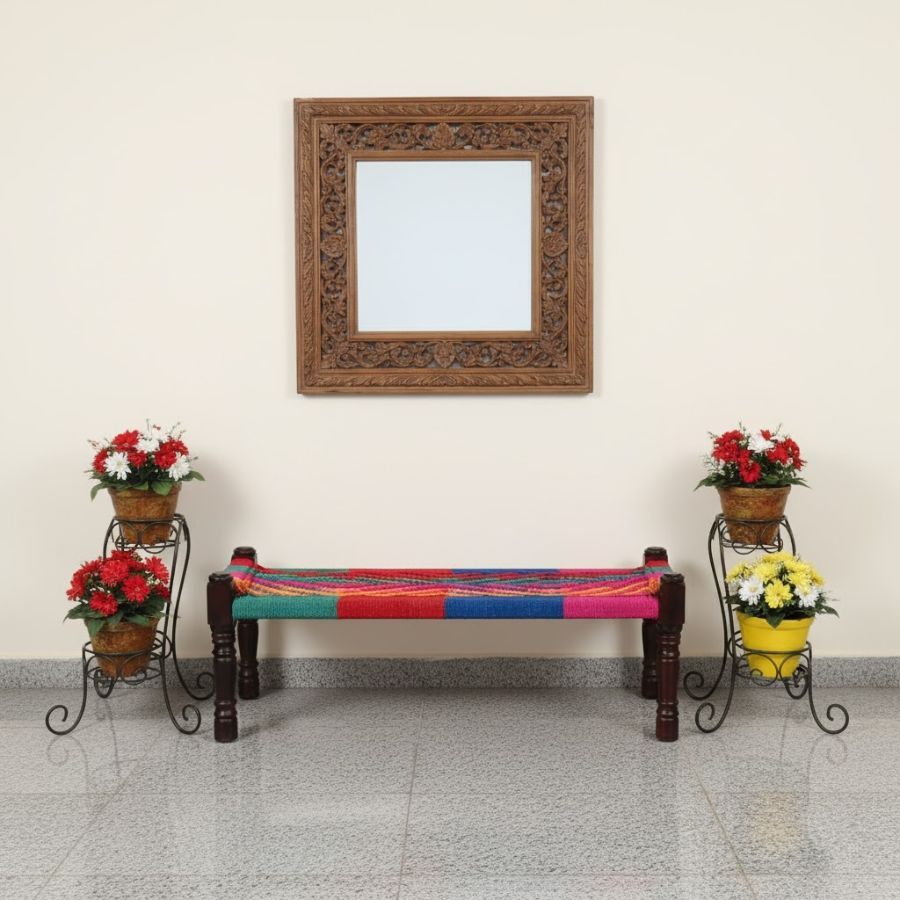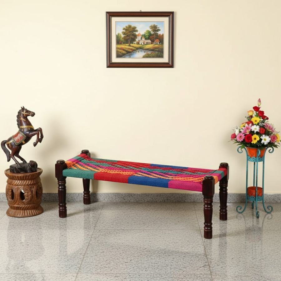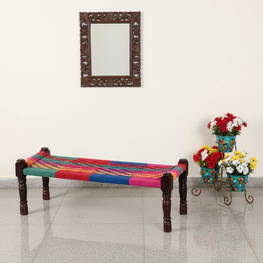 Brighten any space with the Wilton Handwoven Sheesham Wood Bench (Multicolor), a handcrafted seating piece bursting with vibrant style. Made from premium sheesham wood for strength and longevity, its woven cotton rope seat features an artistic mix of red, blue, orange, green, and yellow—perfect for patios, balconies, living rooms, or boho-themed corners. This backless bench is versatile, lightweight, and easy to move, offering comfortable seating and a cheerful accent both indoors or outdoors. Celebrate artisanal tradition with an eye-catching, functional addition to home décor.