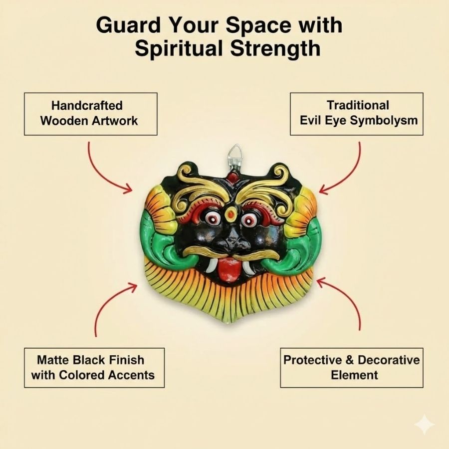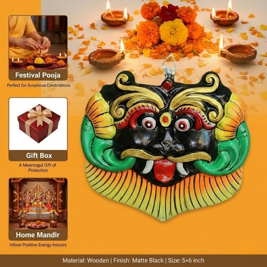 Elevate your home decor with this stunning handcrafted wooden Bhairava mask, a powerful embodiment of Lord Shiva’s fierce form from Indian mythology. Featuring a striking black face with bulging red eyes, a protruding tongue, and golden mane, it’s adorned in vibrant multicolors—deep green ears, orange-yellow floral accents, and intricate swirling patterns. Perfect as a wall hanging with its sturdy loop, this Rajasthan-inspired artifact wards off evil and infuses spiritual energy into living rooms, pooja spaces, or galleries. Artisan-carved for authenticity, it blends traditional craftsmanship with bold aesthetics, ideal for cultural enthusiasts seeking protective talismans that captivate at first glance.