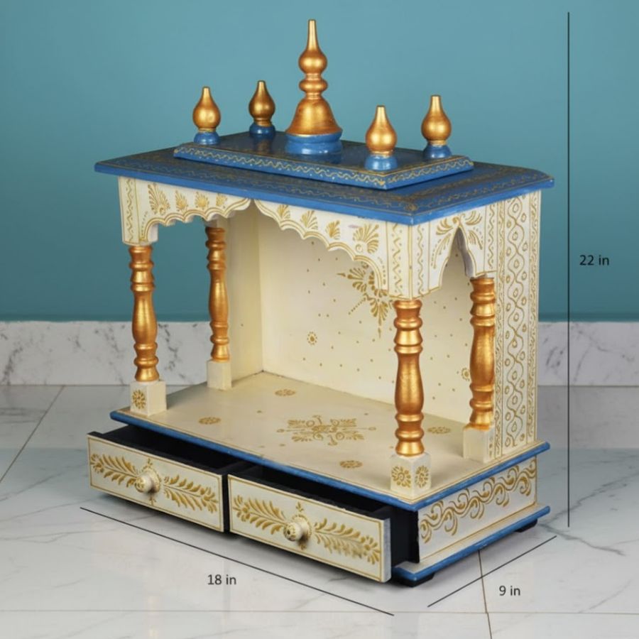 Furnshine – Wooden Temple for Home Pooja Mandir with Hand‑Painted White, Blue & Golden Finish, Twin Drawer Storage, Wall‑Mount/Tabletop Wooden Mandir for Living Room & Office Decor