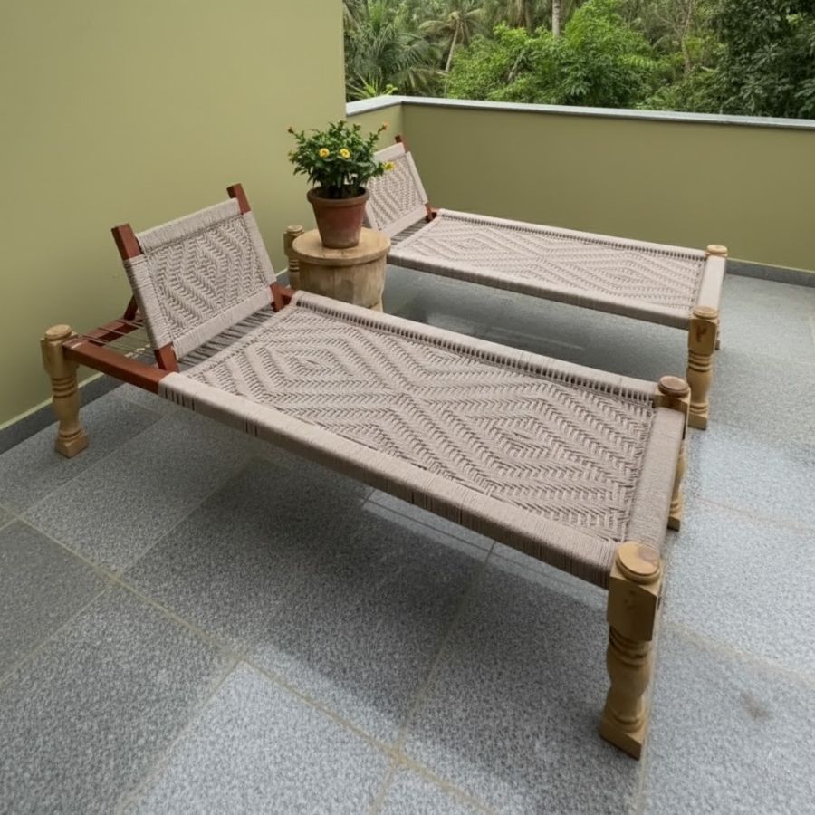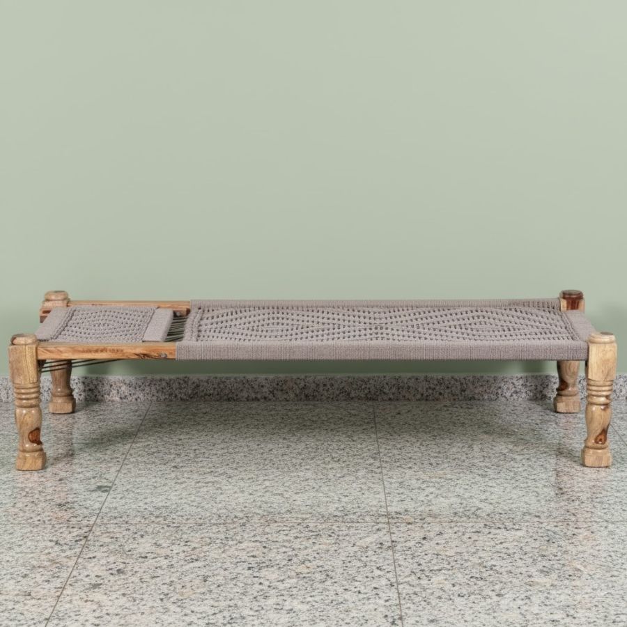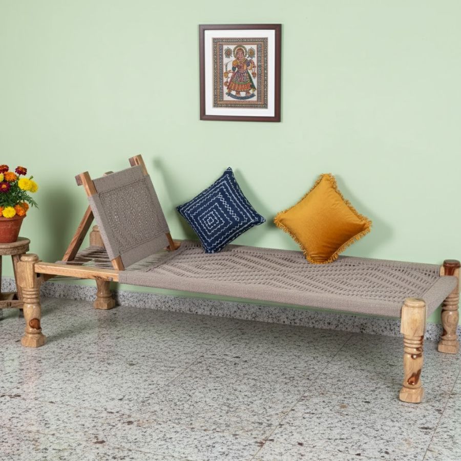 Furnshine – Yarrow Solid Sheesham Wood Handwoven Charpai with Backrest (Natural Beige)