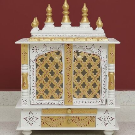 Furnshine – Handcrafted Wooden Pooja Mandir for Home – White Gold Temple with Double Drawer & Decorative Doors for Home and Office Décor