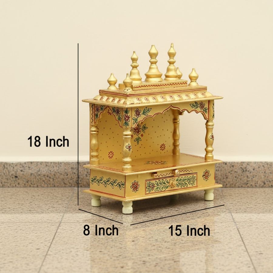 Give your pooja corner a vibrant traditional upgrade with this Furn Shine hand-painted wooden temple in a warm yellow finish, sized 15 x 8 x 18 inches. Intricate floral motifs, turned pillars and shikhara-style domes create a classic mandap look that suits both modern and ethnic interiors. The spacious platform comfortably accommodates idols, while the front drawer keeps incense sticks, matchbox and other essentials neatly tucked away. Lightweight yet sturdy, this mandir is ideal for home or office, adding a serene, devotional focal point to any tabletop or console.