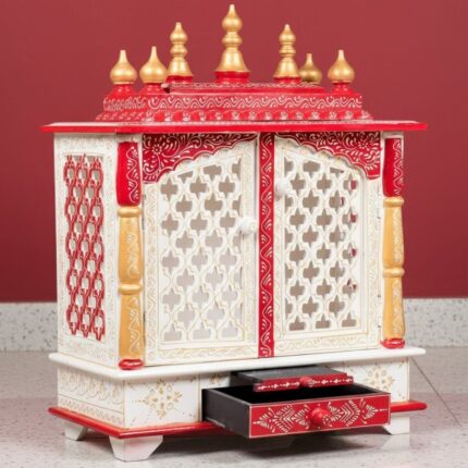 Furnshine – Handcrafted Wooden Pooja Mandir for Home – Red White Gold Temple with Drawer & Jaali Doors for Home and Office Décor