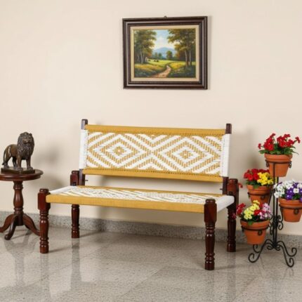 Furnshine – Stark Solid Sheesham Wood Handwoven Backrest Bench (Yellow & White)